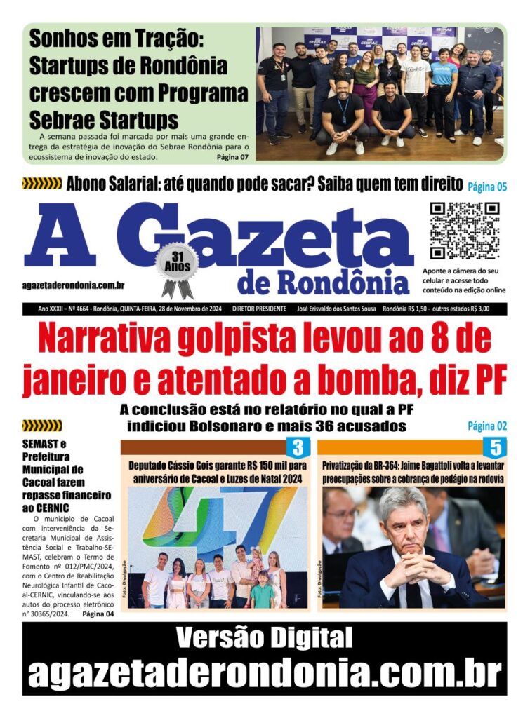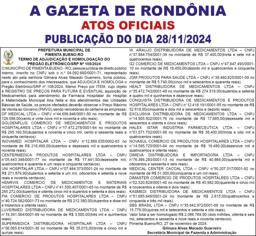 A GAZETA DE RONDÔNIA ATOS OFICIAIS PUBLICAÇÃO DO DIA 28/11/2024 Por Diretor Chefe 27 de novembro de 2024 às 17h24