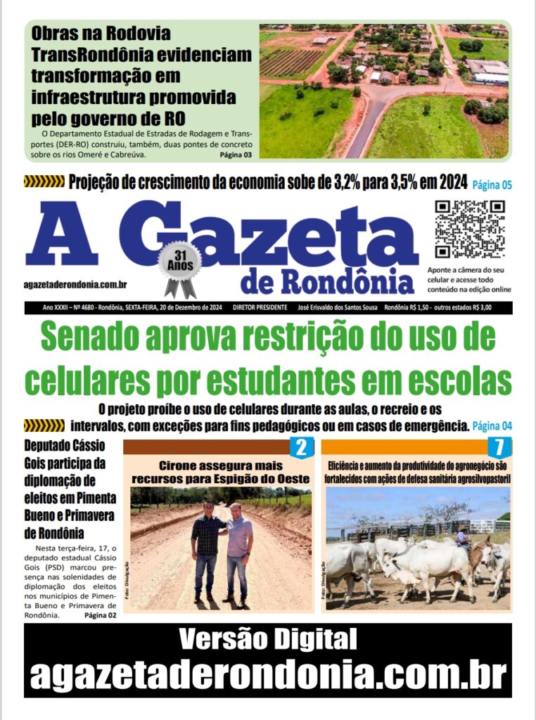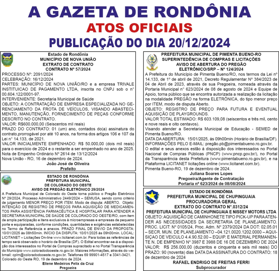 A GAZETA DE RONDÔNIA ATOS OFICIAIS PUBLICAÇÃO DO DIA 20/12/2024 Por Diretor Chefe 19 de dezembro de 2024 às 16h24