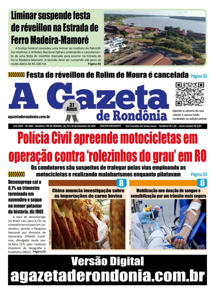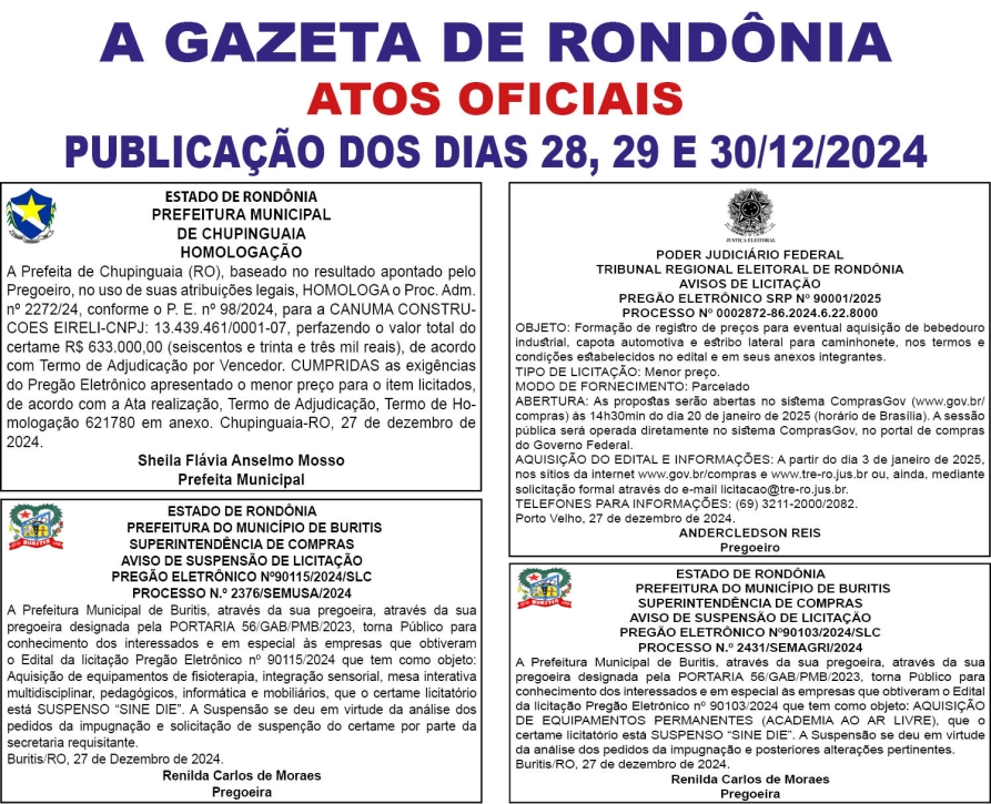 A GAZETA DE RONDÔNIA ATOS OFICIAIS PUBLICAÇÃO DOS DIAS 28, 29 E 30/12/2024 Por Diretor Chefe 27 de dezembro de 2024 às 16h28