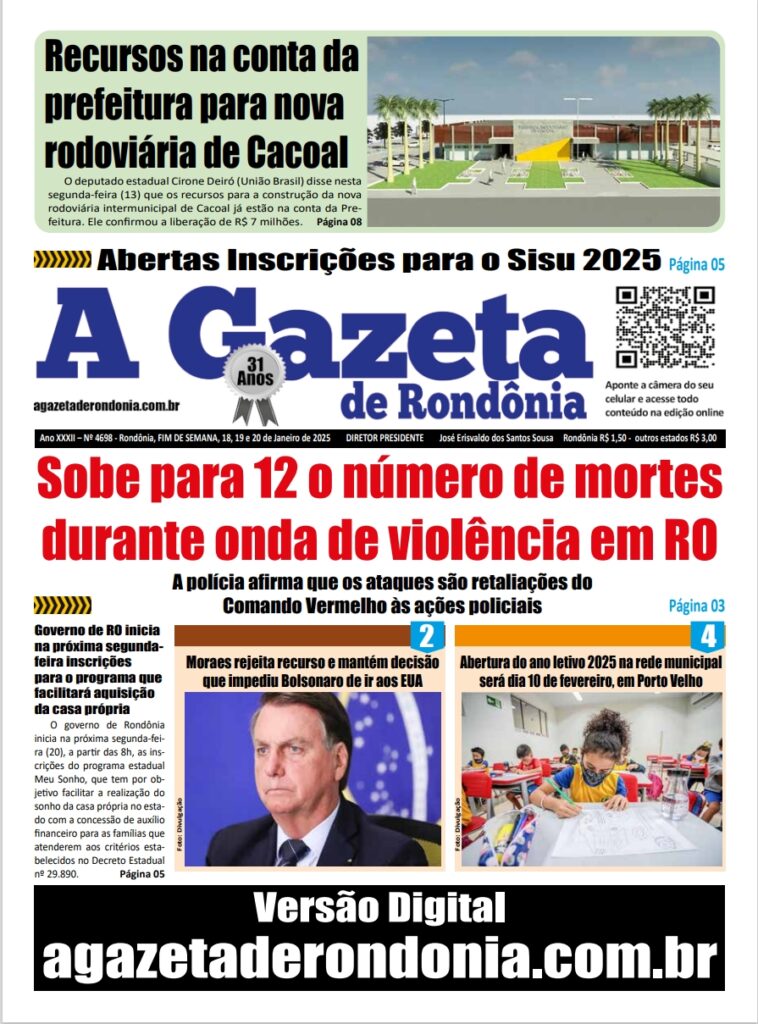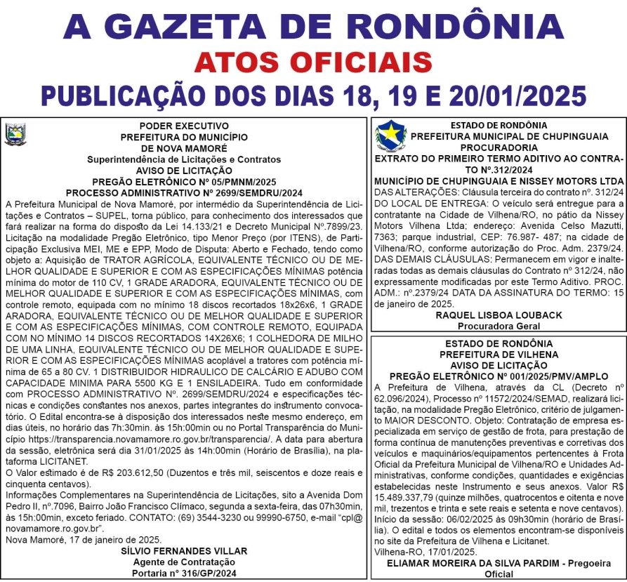 A GAZETA DE RONDÔNIA ATOS OFICIAIS PUBLICAÇÃO DOS DIAS 18, 19 E 20/01/2025 Por Diretor Chefe 17 de janeiro de 2025 às 17h44