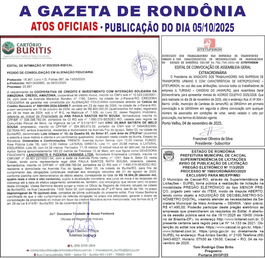 A GAZETA DE RONDÔNIA ATOS OFICIAIS PUBLICAÇÃO DO DIA 05/11/2025 Por Diretor Chefe 4 de novembro de 2025 às 17h39