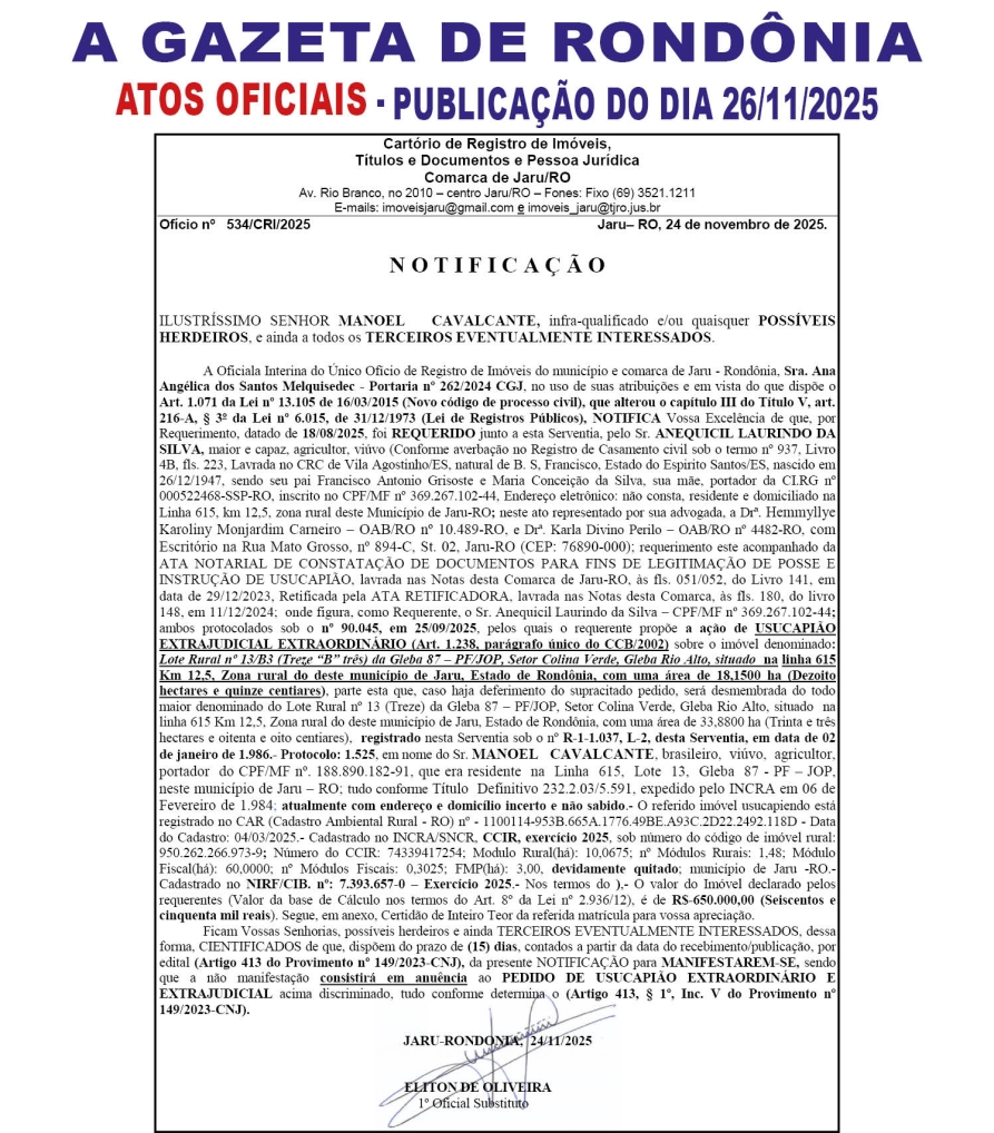 A GAZETA DE RONDÔNIA ATOS OFICIAIS PUBLICAÇÃO DO DIA 26/11/2025 Por Diretor Chefe 25 de novembro de 2025 às 22h40