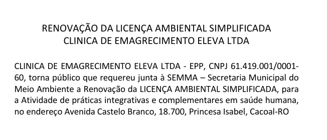 RENOVAÇÃO DA LICENÇA AMBIENTAL SIMPLIFICADA CLINICA DE EMAGRECIMENTO ELEVA LTDA