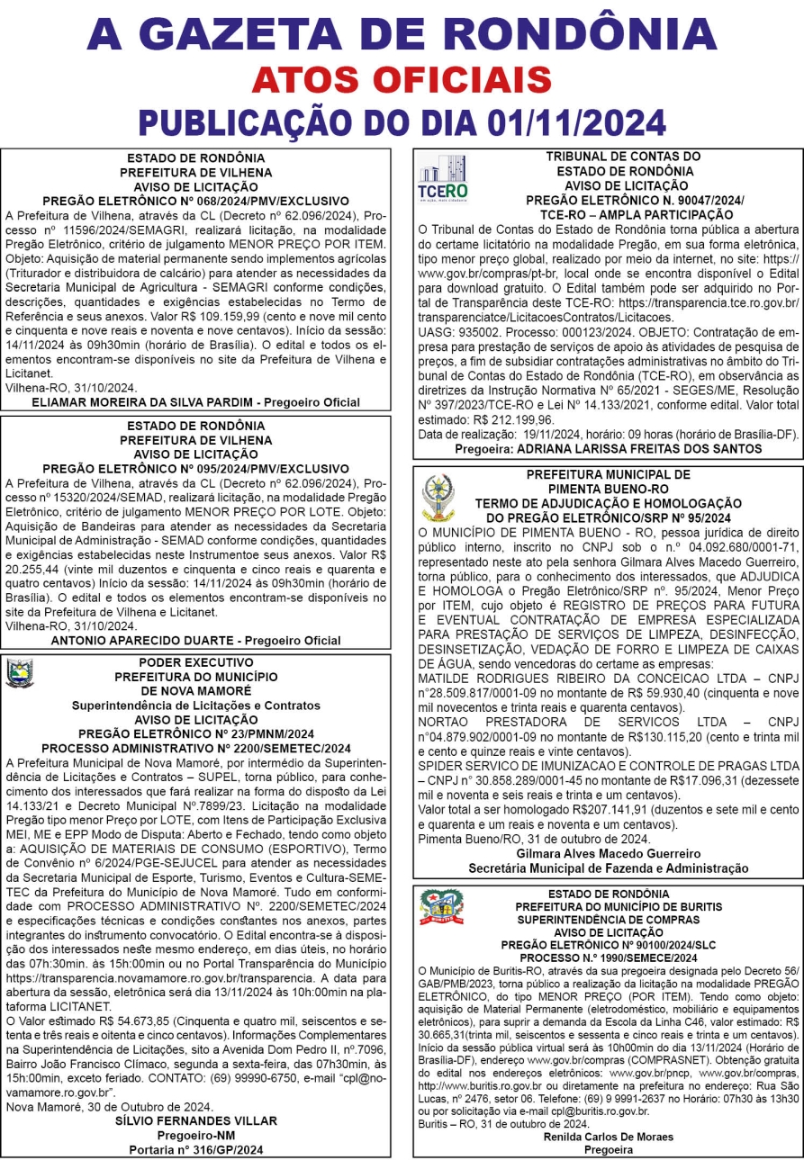 A GAZETA DE RONDÔNIA ATOS OFICIAIS PUBLICAÇÃO DO DIA 01/11/2024