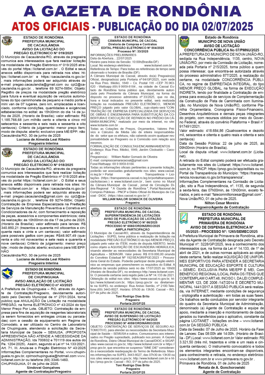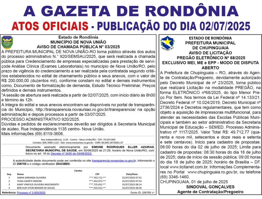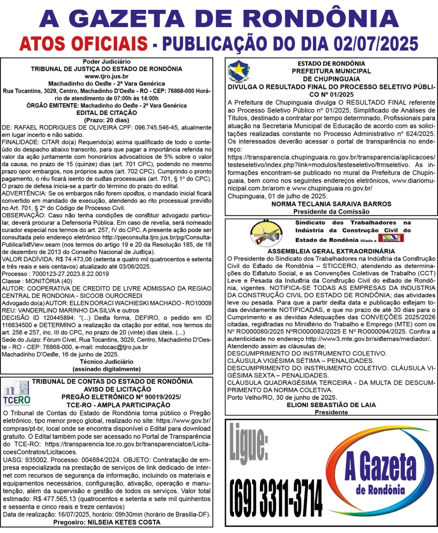 A GAZETA DE RONDÔNIA ATOS OFICIAIS PUBLICAÇÃO DO DIA 02/07/2025