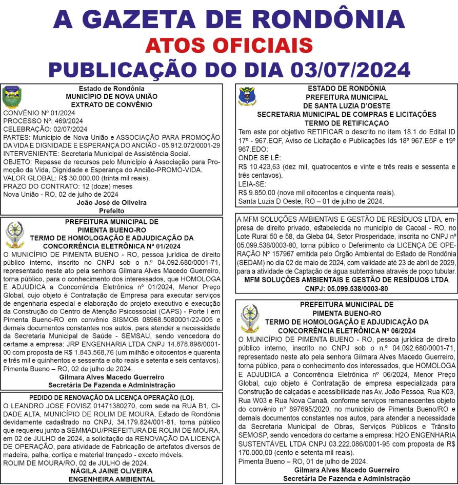 A GAZETA DE RONDÔNIA ATOS OFICIAIS PUBLICAÇÃO DO DIA 03/07/2024