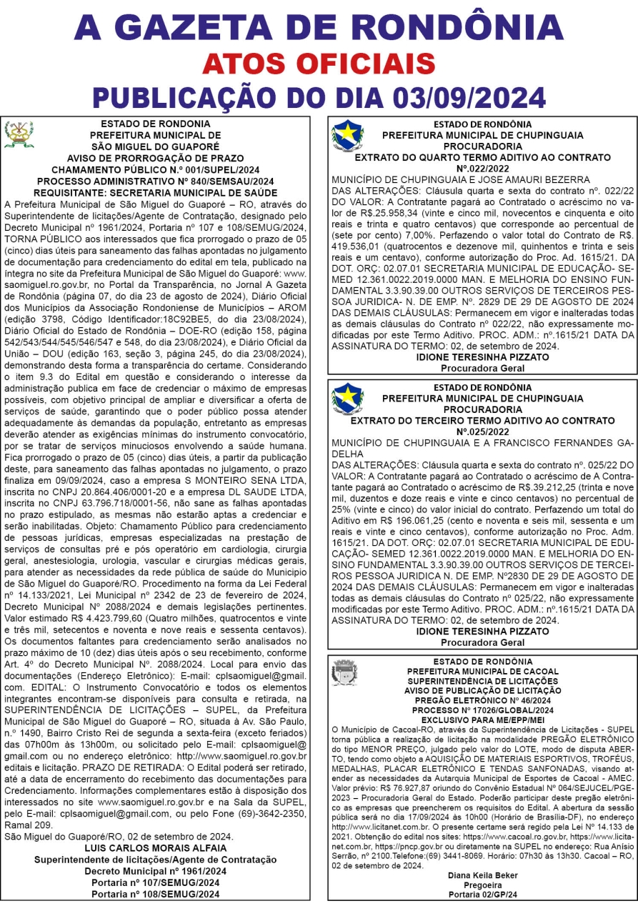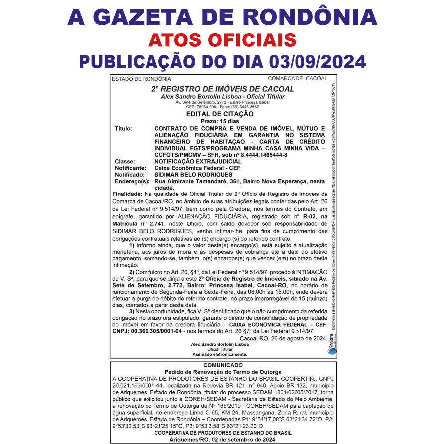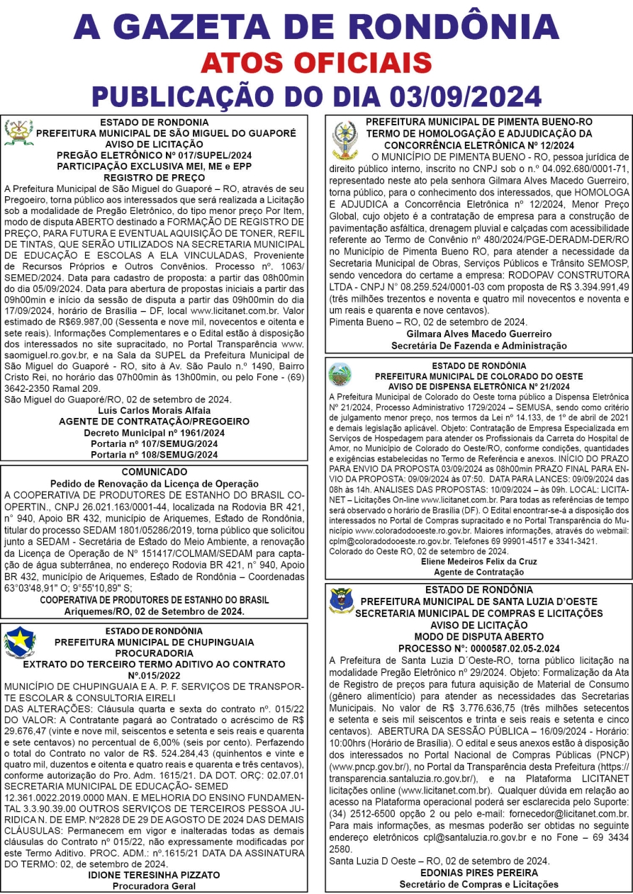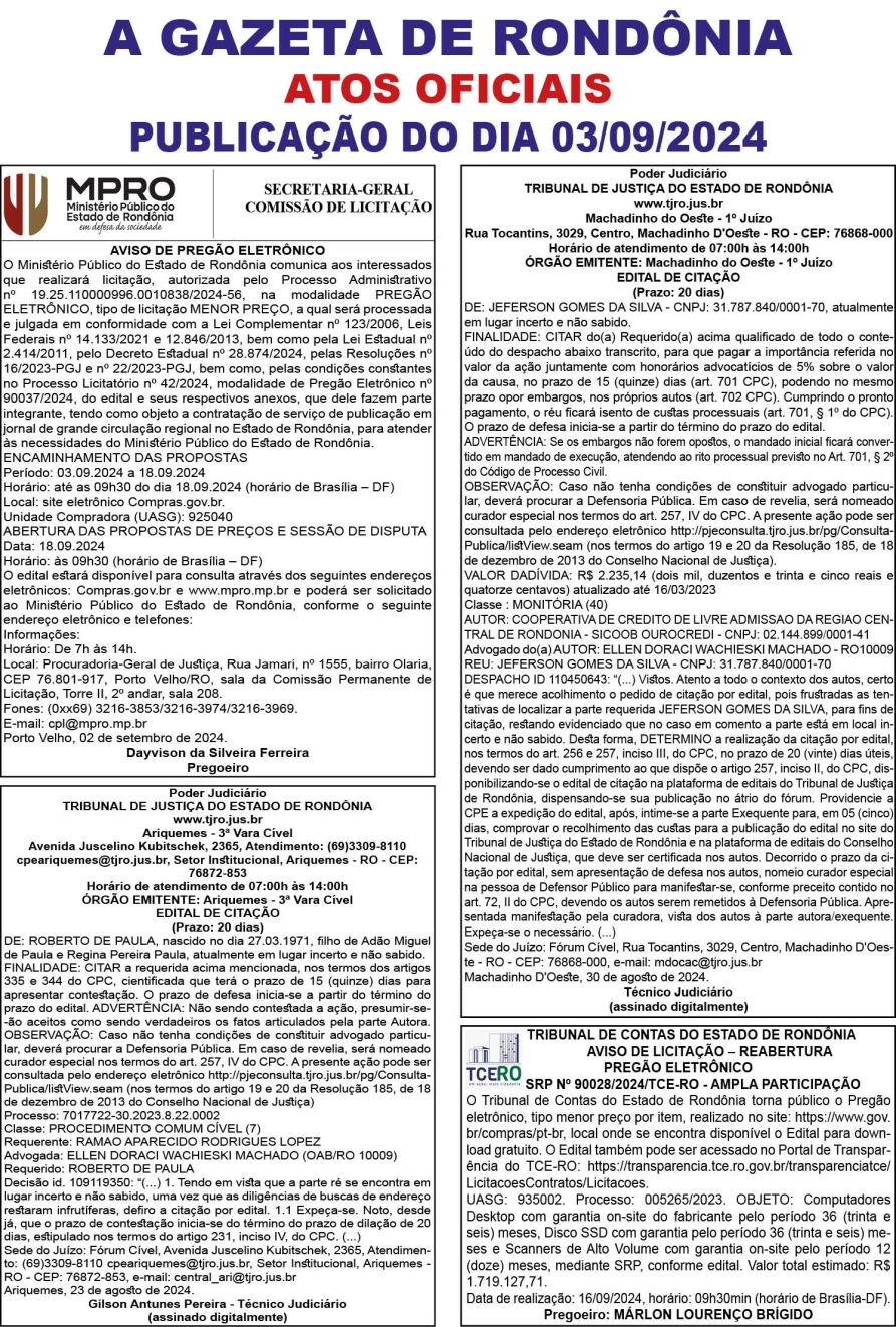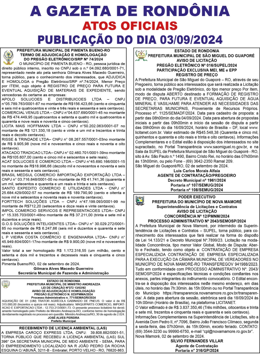 A GAZETA DE RONDÔNIA ATOS OFICIAIS PUBLICAÇÃO DO DIA 03/09/2024