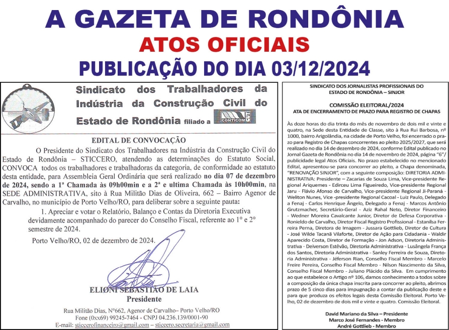 A GAZETA DE RONDÔNIA ATOS OFICIAIS PUBLICAÇÃO DO DIA 03/12/2024