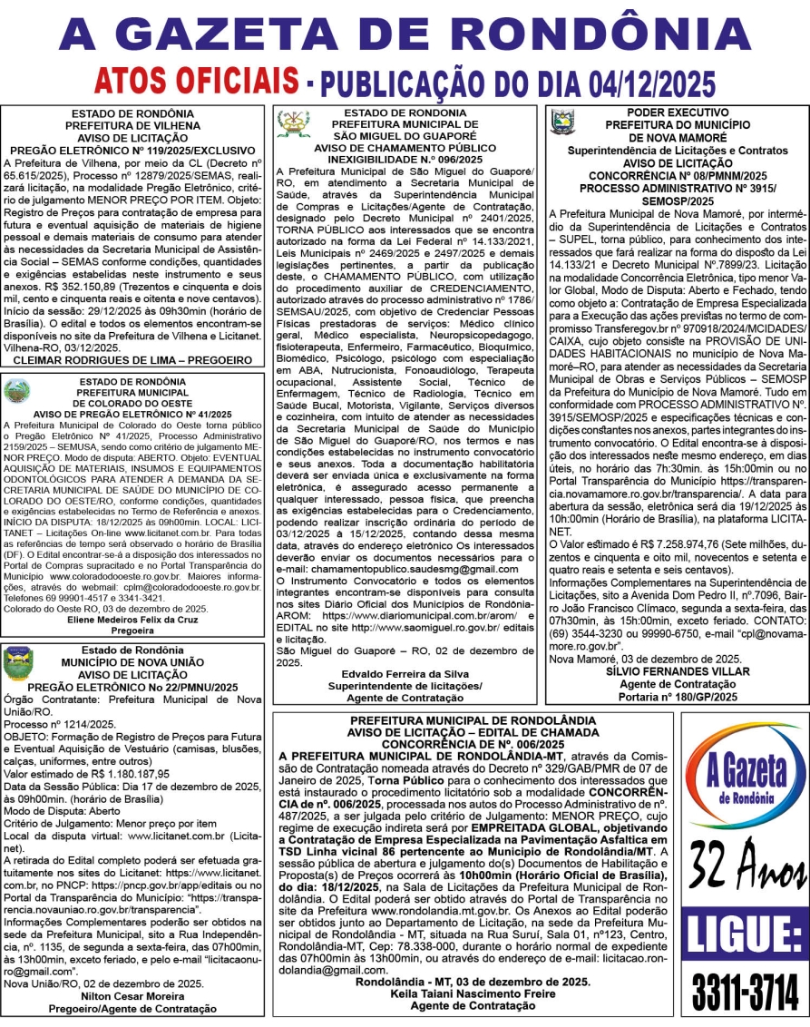 A GAZETA DE RONDÔNIA ATOS OFICIAIS PUBLICAÇÃO DO DIA 04/12/2025