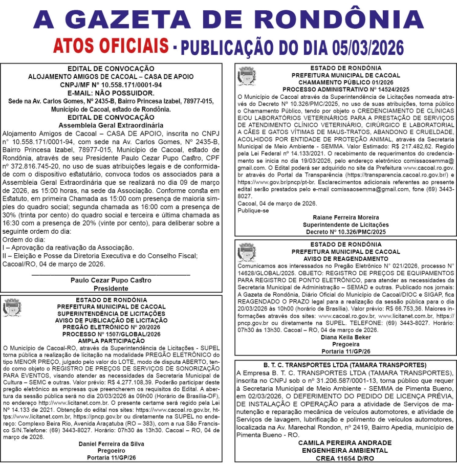 A GAZETA DE RONDÔNIA ATOS OFICIAIS PUBLICAÇÃO DO DIA 05/03/2026