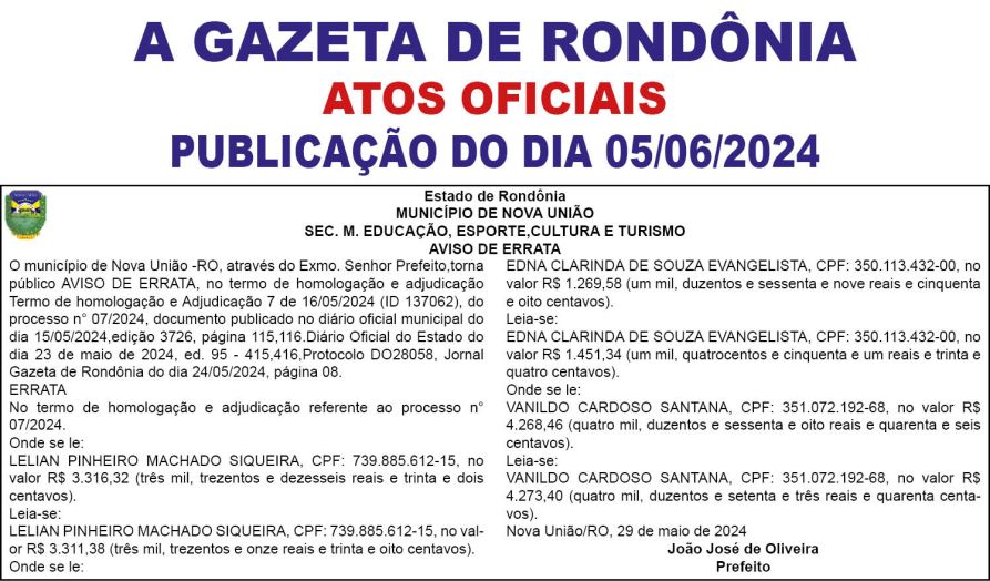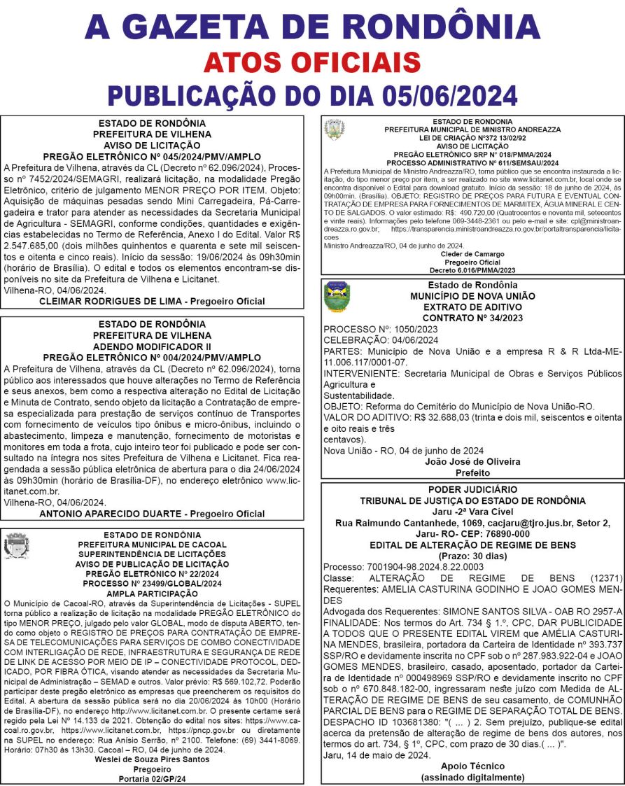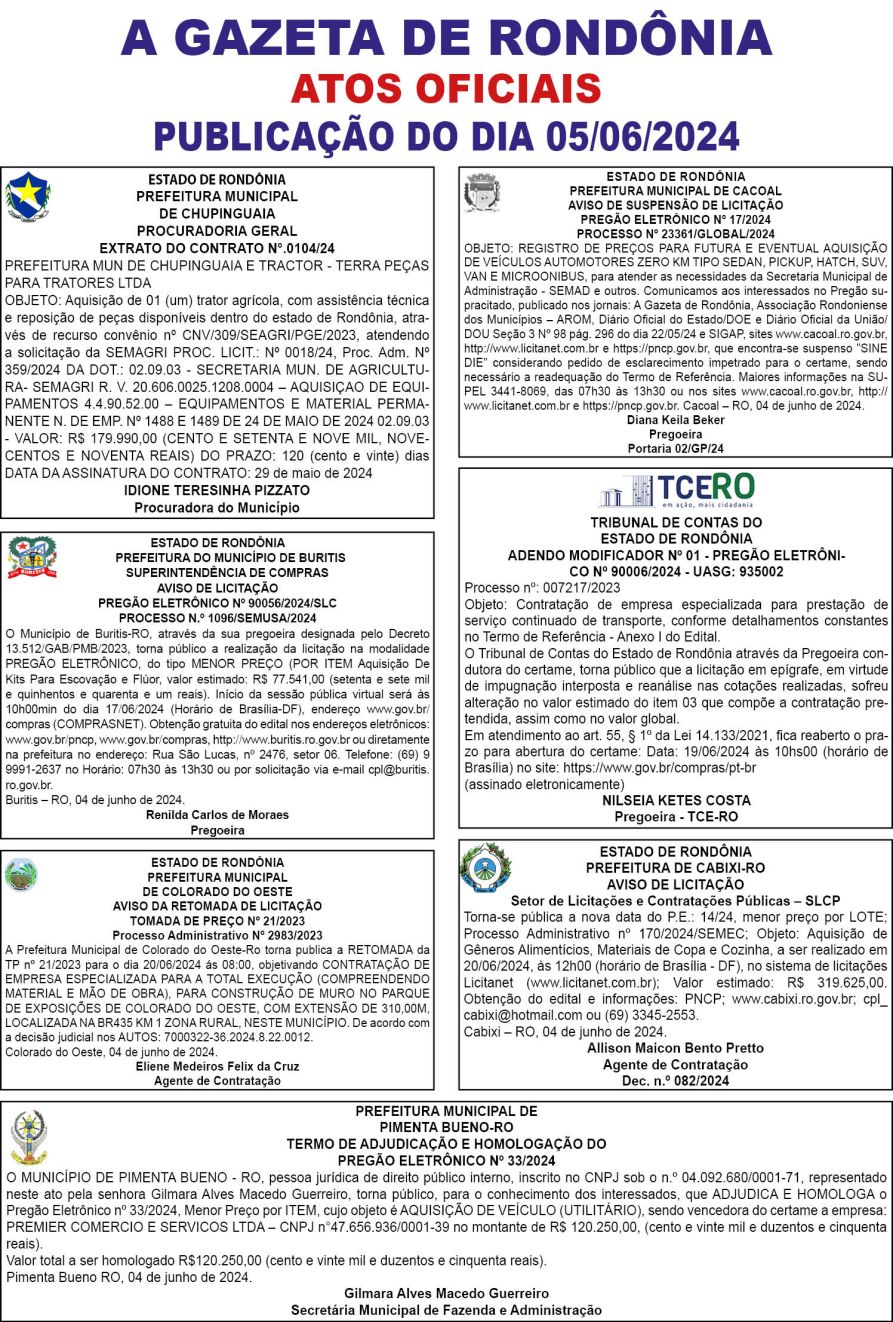 A GAZETA DE RONDÔNIA ATOS OFICIAIS PUBLICAÇÃO DO DIA 05/06/2024