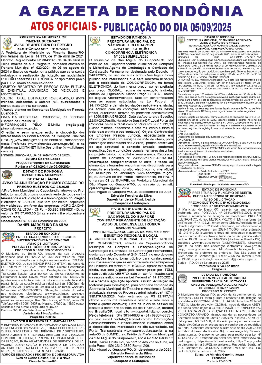 A GAZETA DE RONDÔNIA ATOS OFICIAIS PUBLICAÇÃO DO DIA 05/09/2025