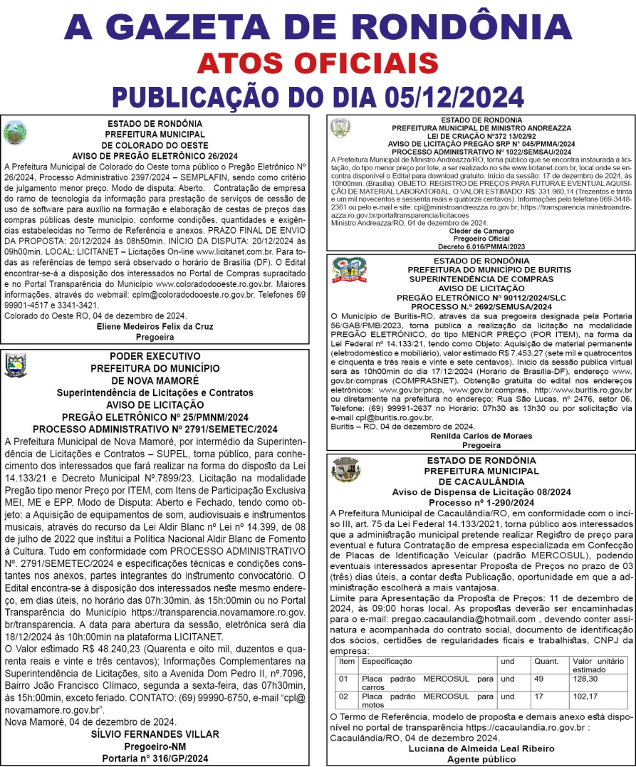 A GAZETA DE RONDÔNIA ATOS OFICIAIS PUBLICAÇÃO DO DIA 05/12/2024