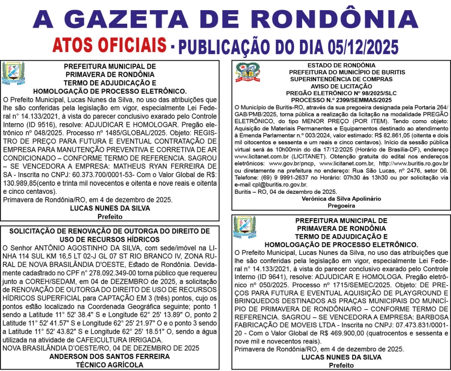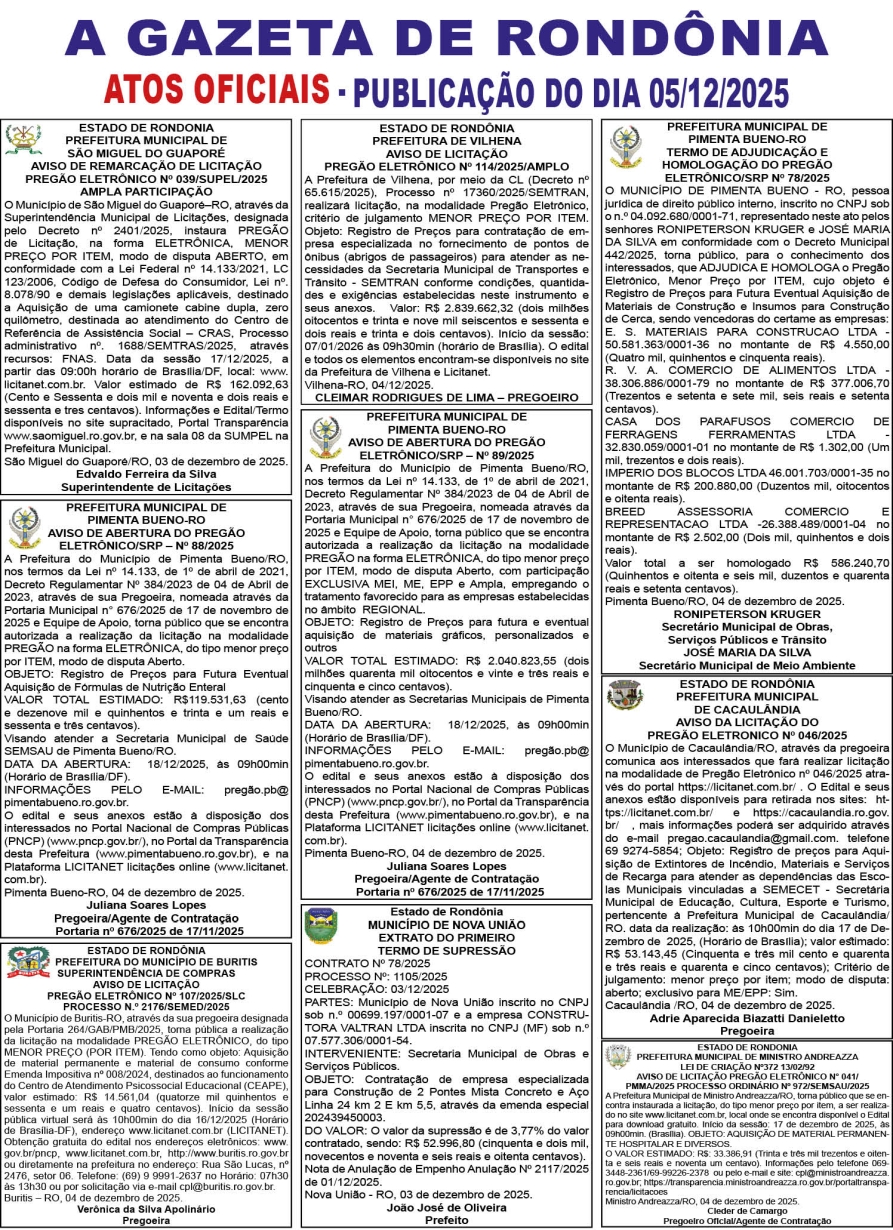 A GAZETA DE RONDÔNIA ATOS OFICIAIS PUBLICAÇÃO DO DIA 05/12/2025