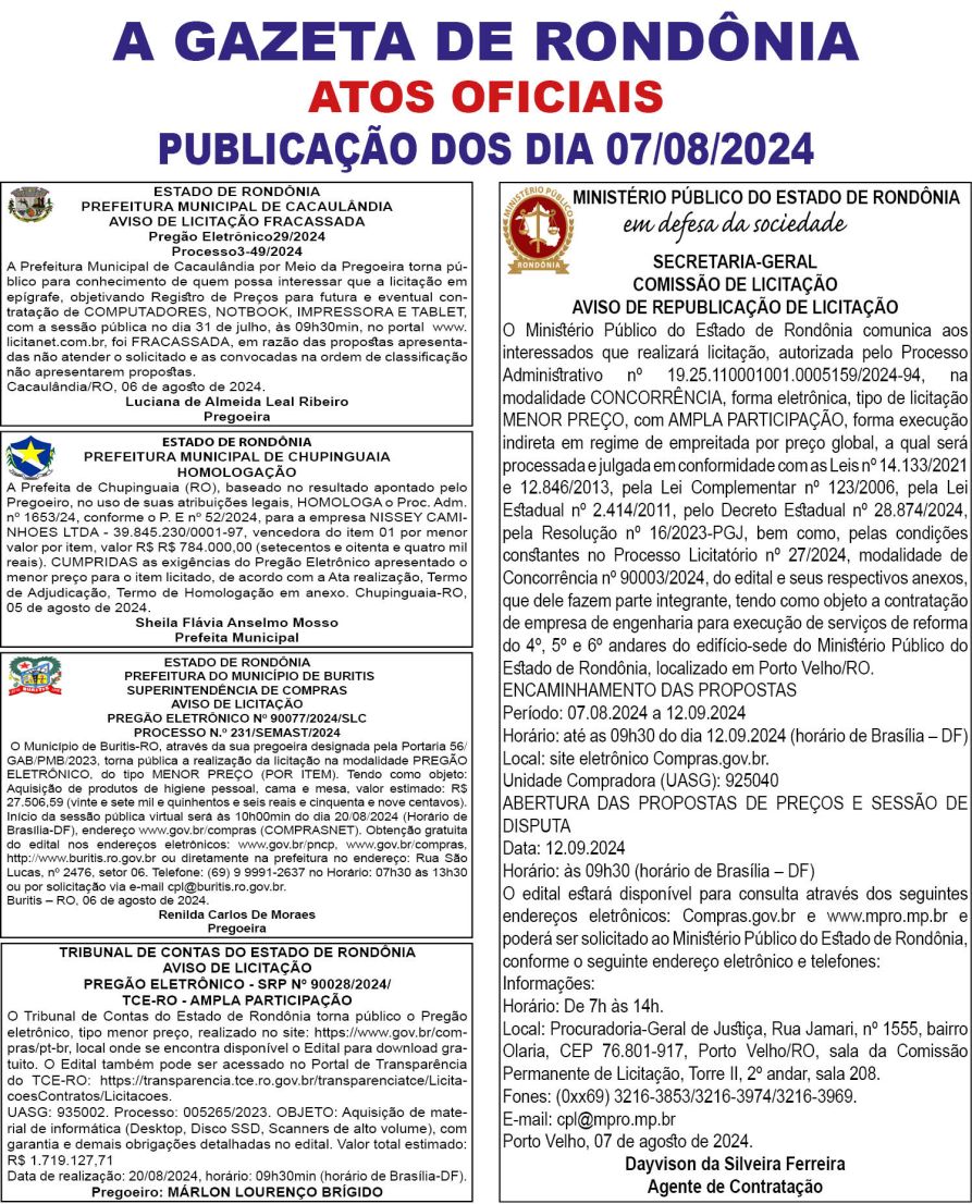 A GAZETA DE RONDÔNIA ATOS OFICIAIS PUBLICAÇÃO DO DIA 07/08/2024