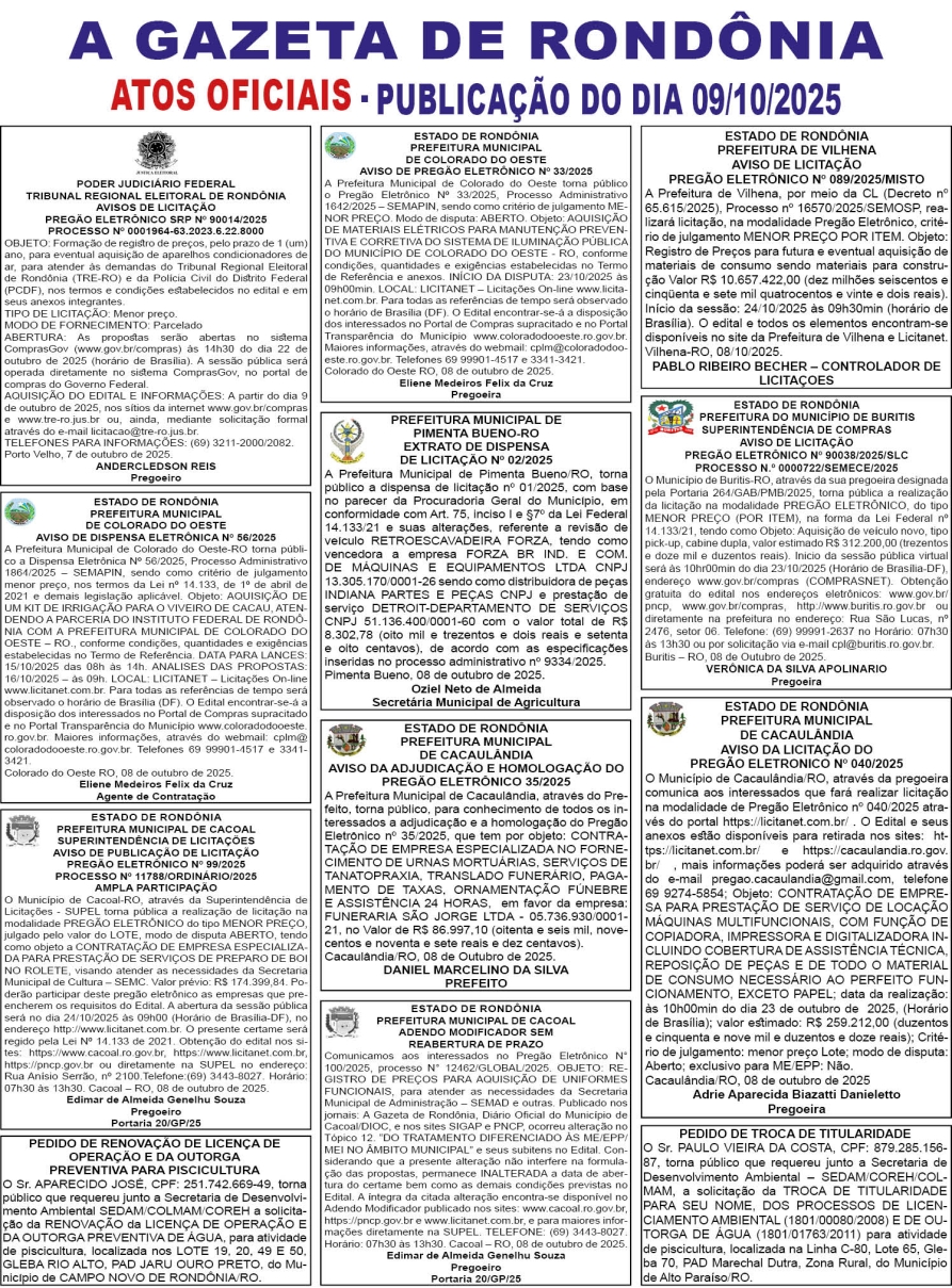 A GAZETA DE RONDÔNIA ATOS OFICIAIS PUBLICAÇÃO DO DIA 09/10/2025