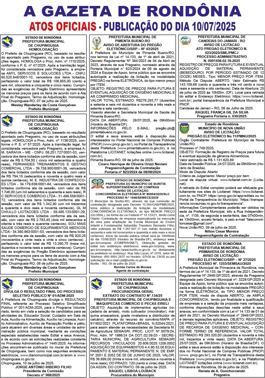A GAZETA DE RONDÔNIA ATOS OFICIAIS PUBLICAÇÃO DO DIA 10/07/2025