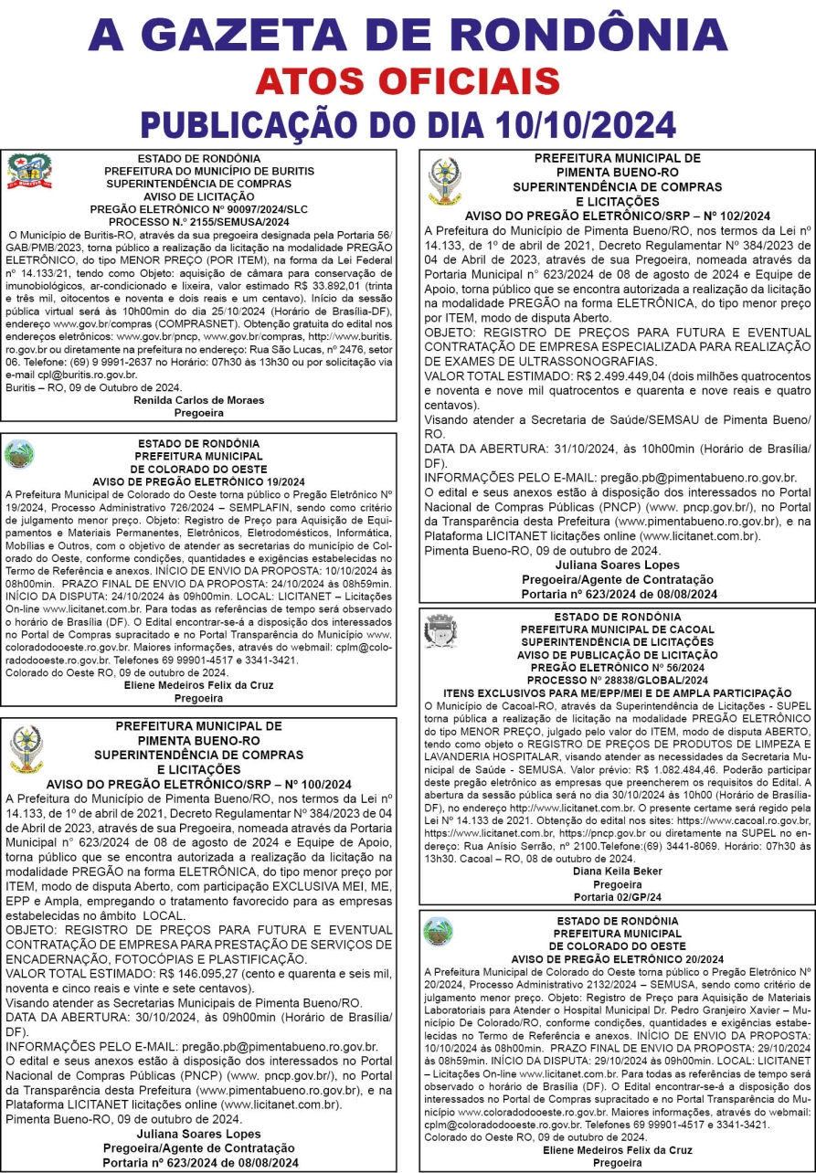 A GAZETA DE RONDÔNIA ATOS OFICIAIS PUBLICAÇÃO DO DIA 10/10/2024