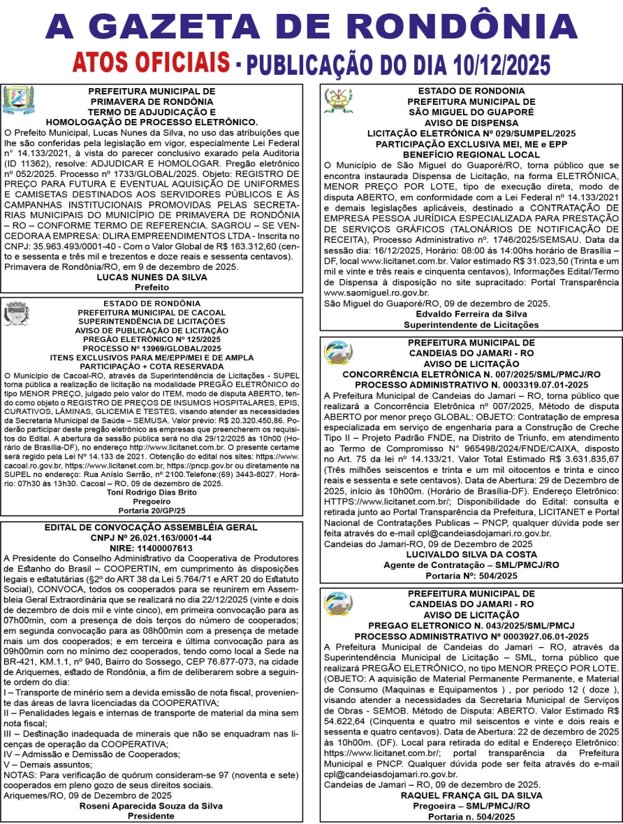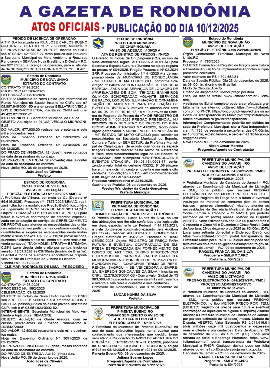 A GAZETA DE RONDÔNIA ATOS OFICIAIS PUBLICAÇÃO DO DIA 10/12/2025