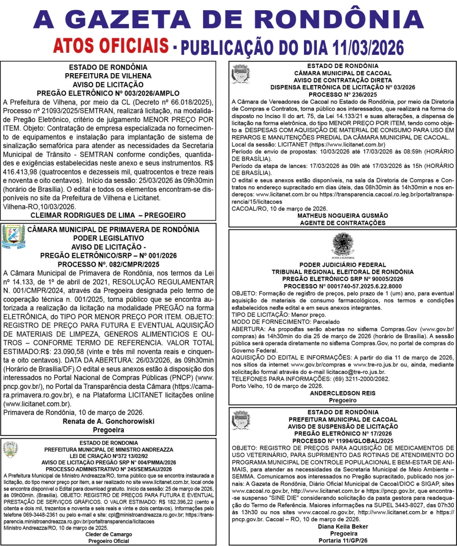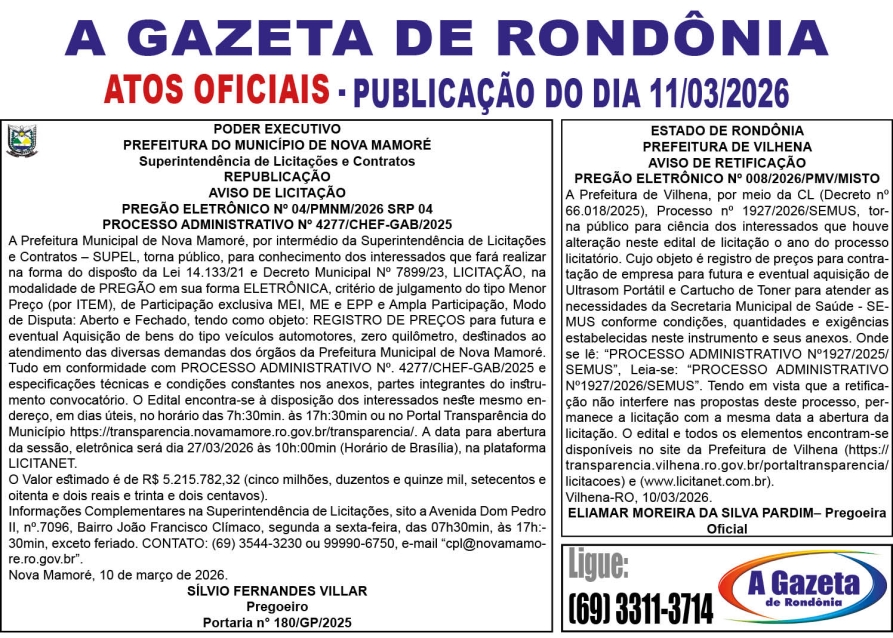 A GAZETA DE RONDÔNIA ATOS OFICIAIS PUBLICAÇÃO DO DIA 11/03/2026