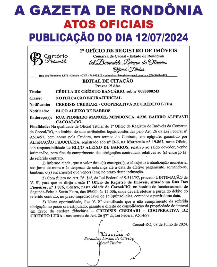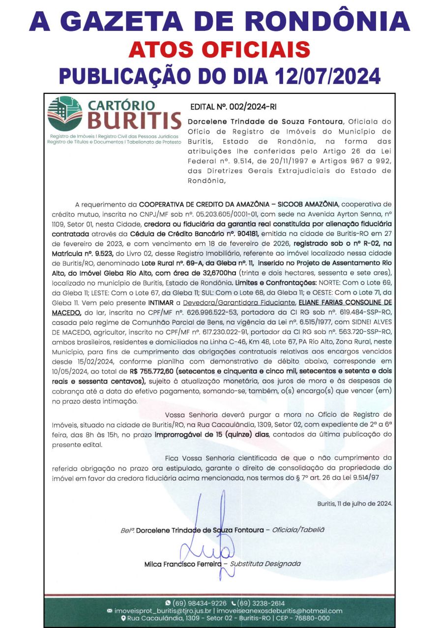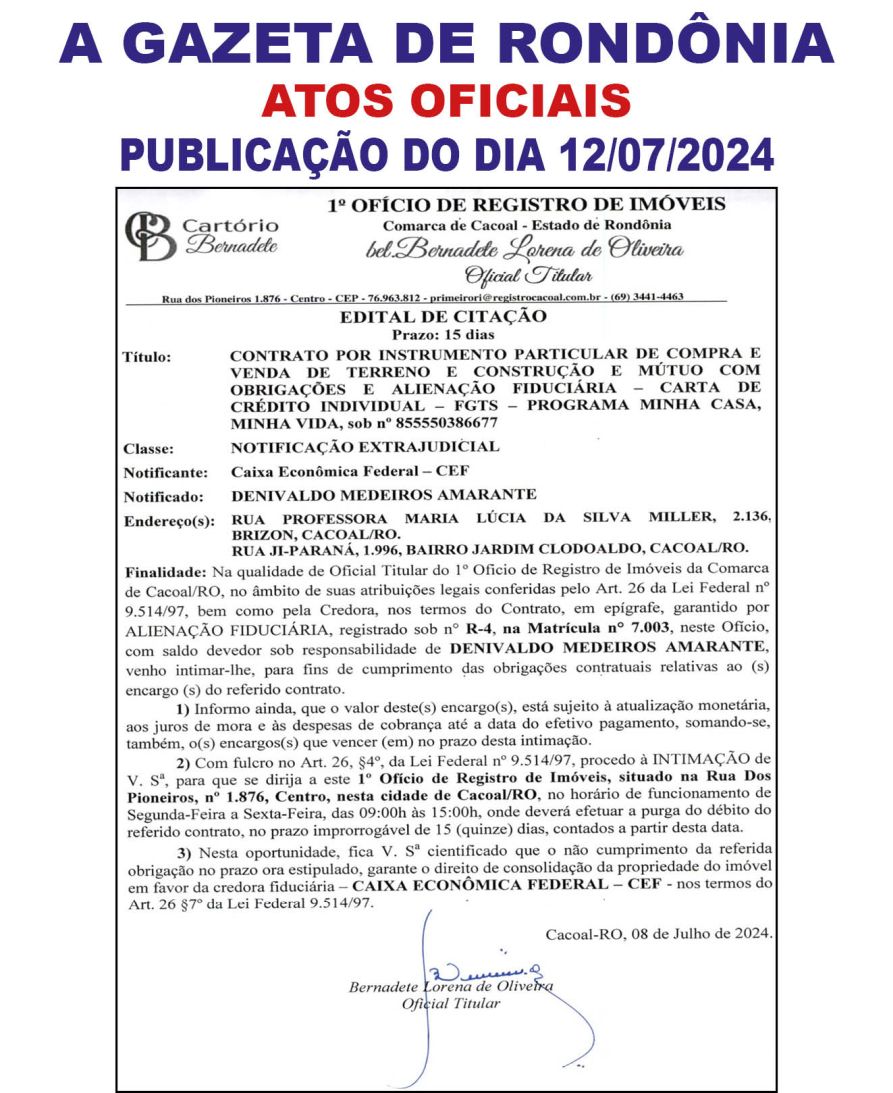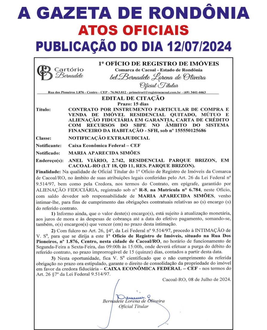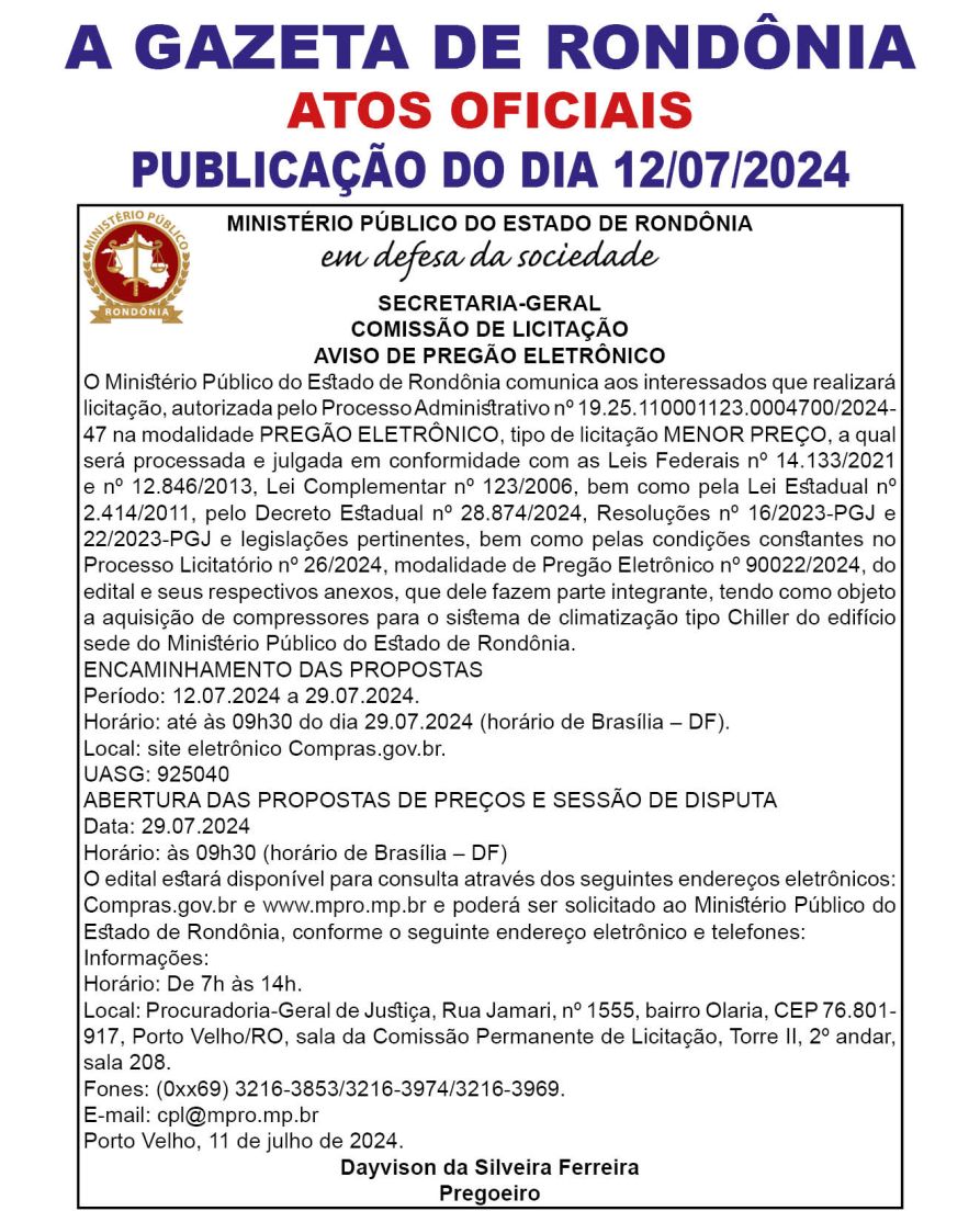 A GAZETA DE RONDÔNIA ATOS OFICIAIS PUBLICAÇÃO DO DIA 12/07/2024