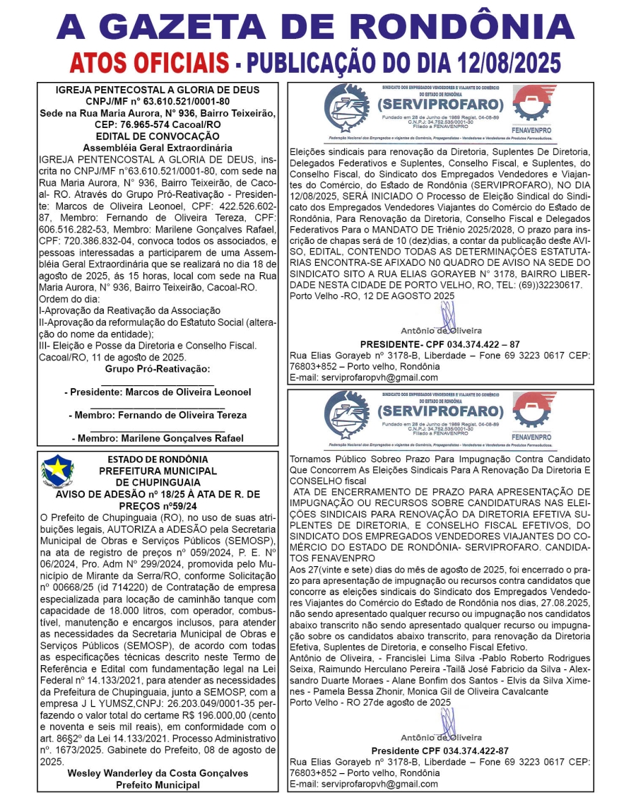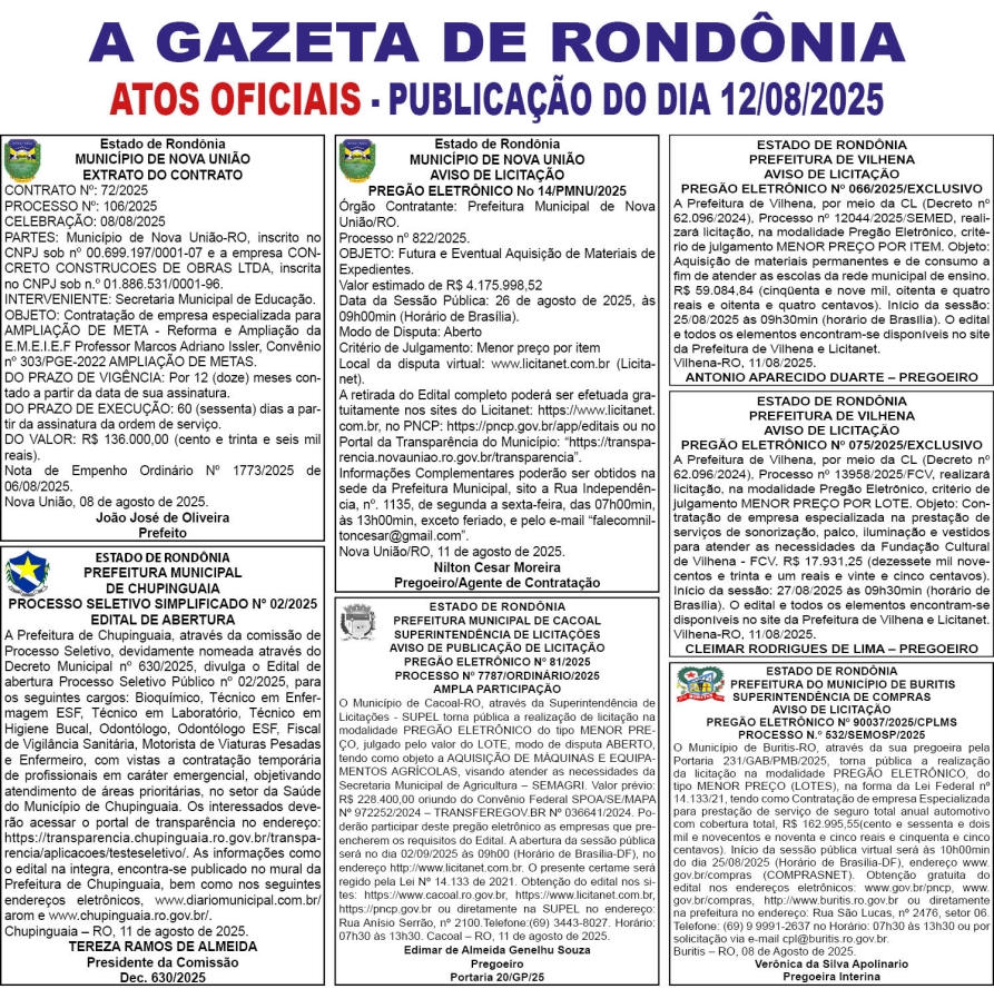 A GAZETA DE RONDÔNIA ATOS OFICIAIS PUBLICAÇÃO DO DIA 12/08/2025