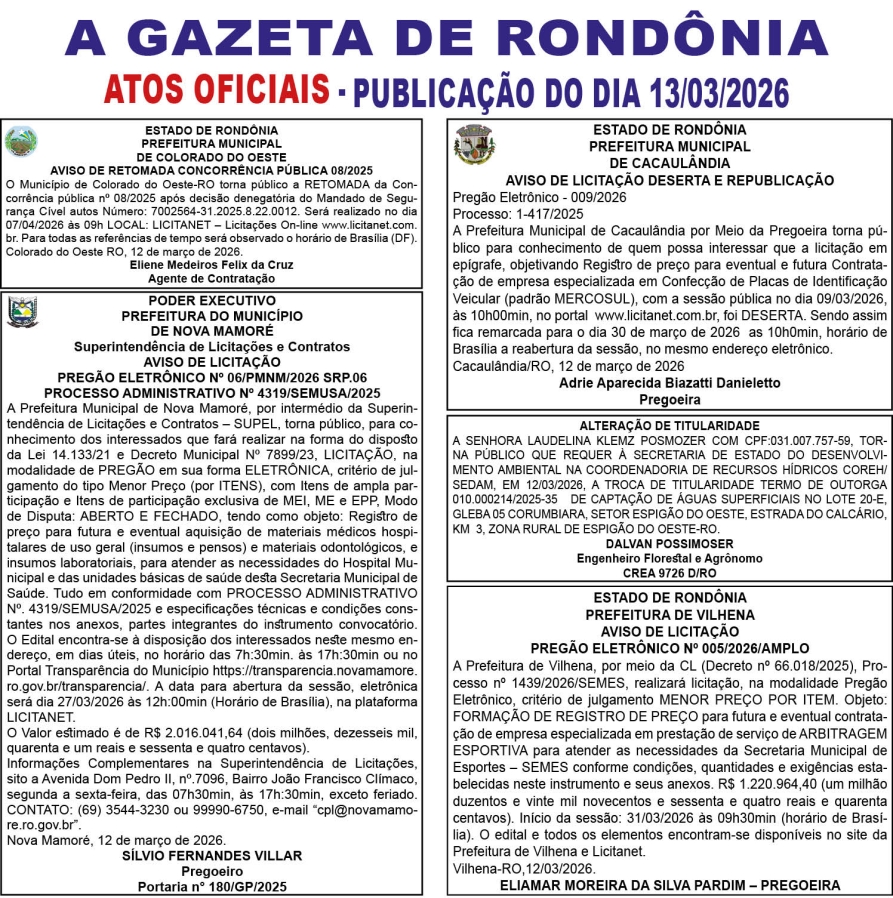 A GAZETA DE RONDÔNIA ATOS OFICIAIS PUBLICAÇÃO DO DIA 13/03/2026