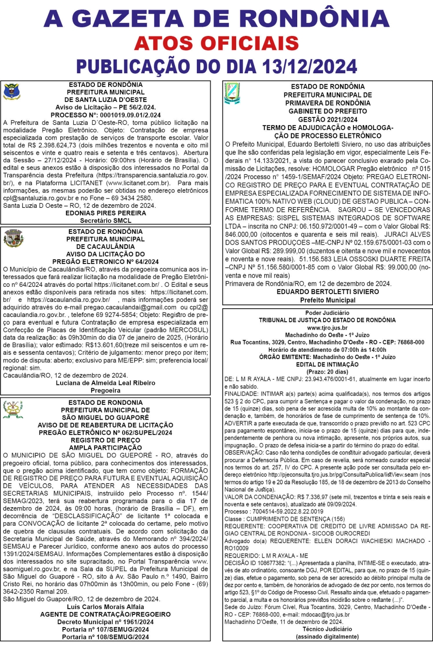 A GAZETA DE RONDÔNIA ATOS OFICIAIS PUBLICAÇÃO DO DIA 13/12/2024