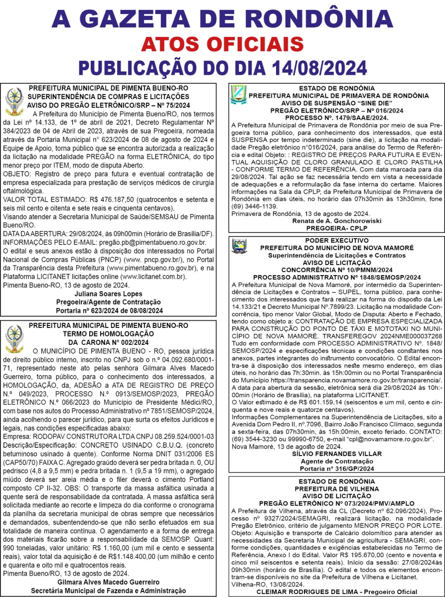 A GAZETA DE RONDÔNIA ATOS OFICIAIS PUBLICAÇÃO DO DIA 14/08/2024