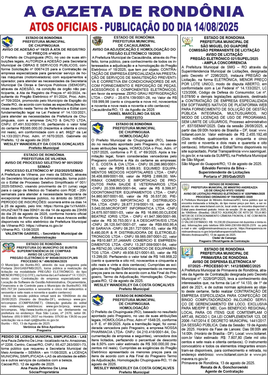 A GAZETA DE RONDÔNIA ATOS OFICIAIS PUBLICAÇÃO DO DIA 14/08/2025