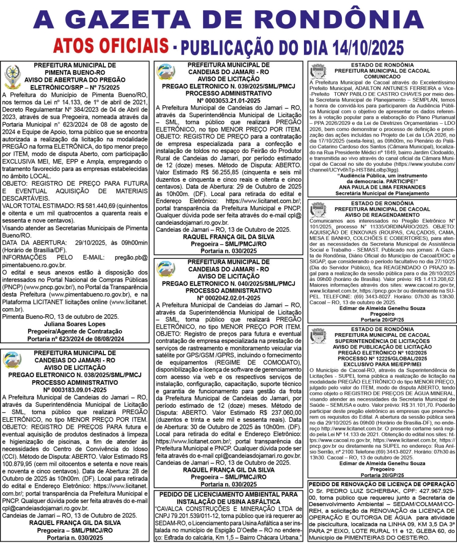 A GAZETA DE RONDÔNIA ATOS OFICIAIS PUBLICAÇÃO DO DIA 14/10/2025