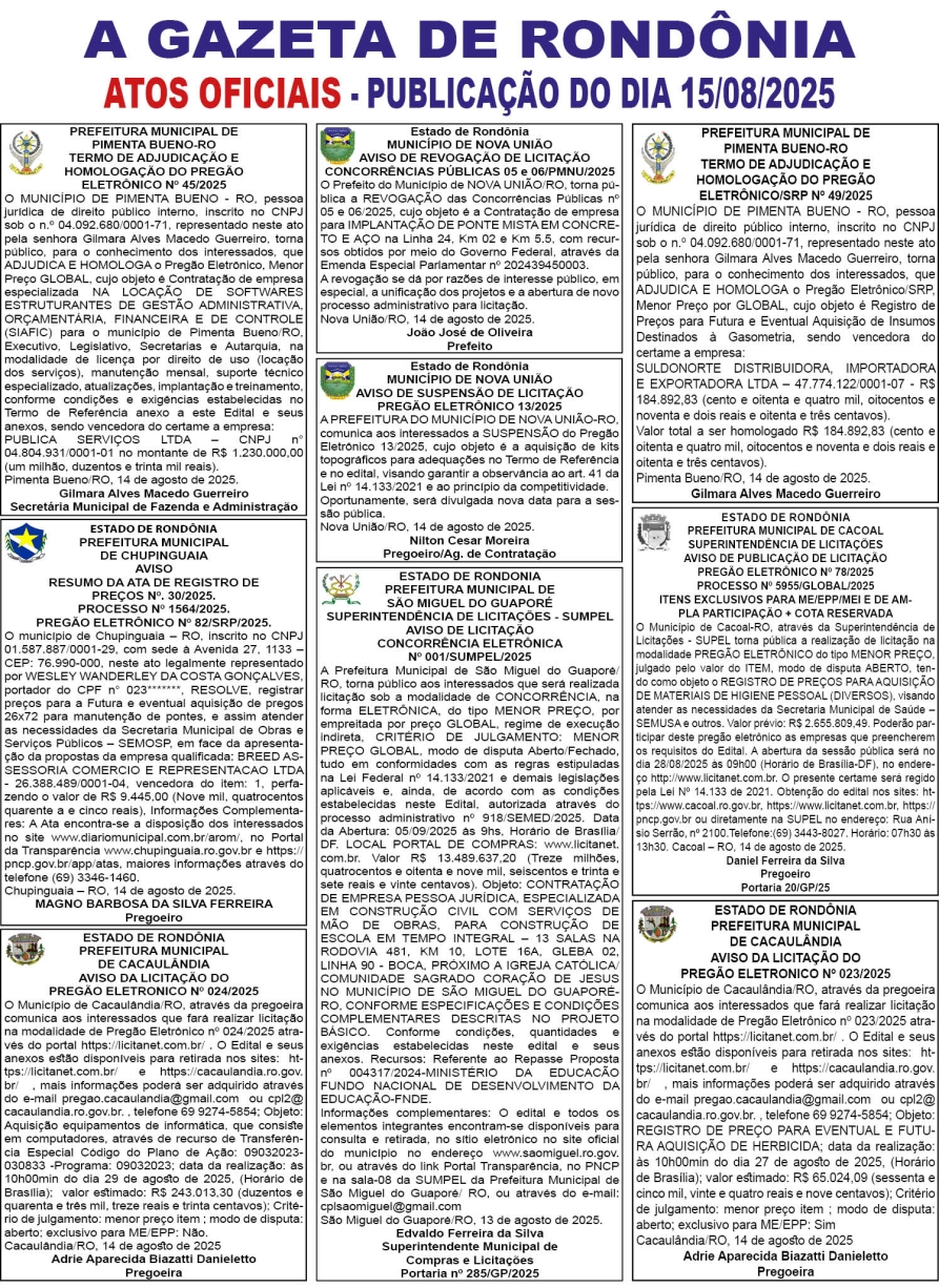 A GAZETA DE RONDÔNIA ATOS OFICIAIS PUBLICAÇÃO DO DIA 15/08/2025