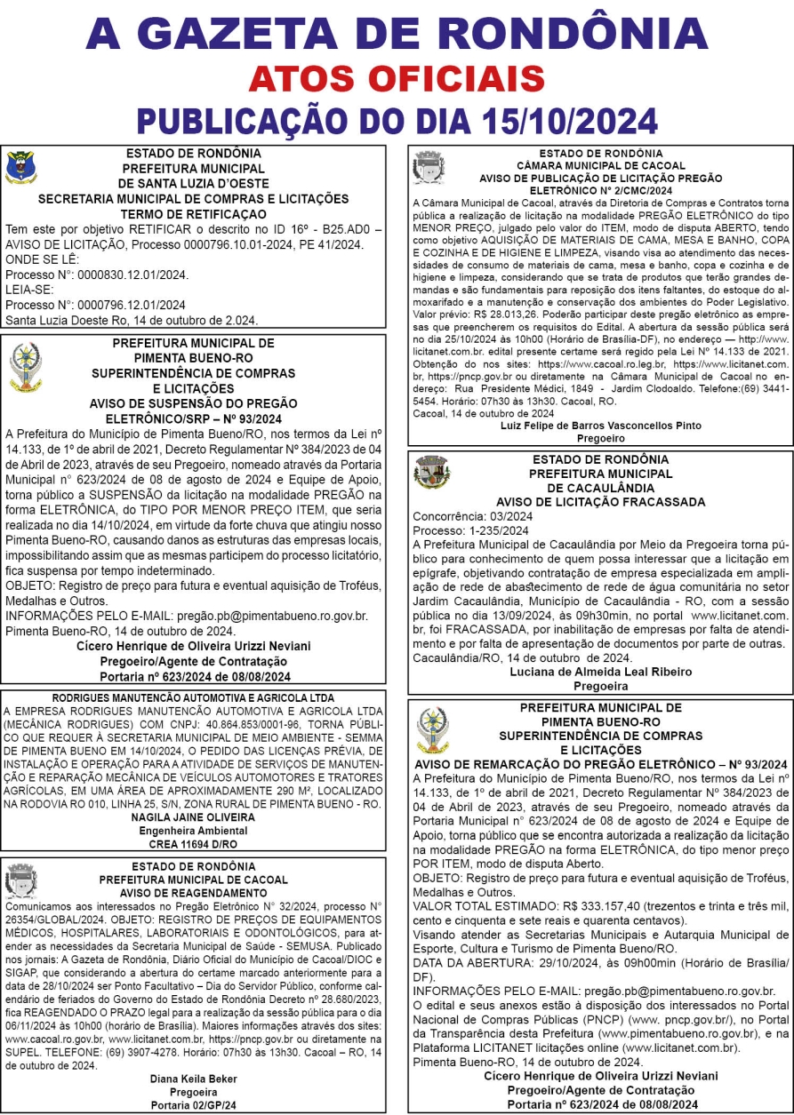 A GAZETA DE RONDÔNIA ATOS OFICIAIS PUBLICAÇÃO DO DIA 15/10/2024