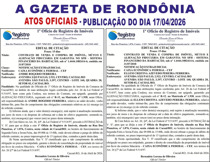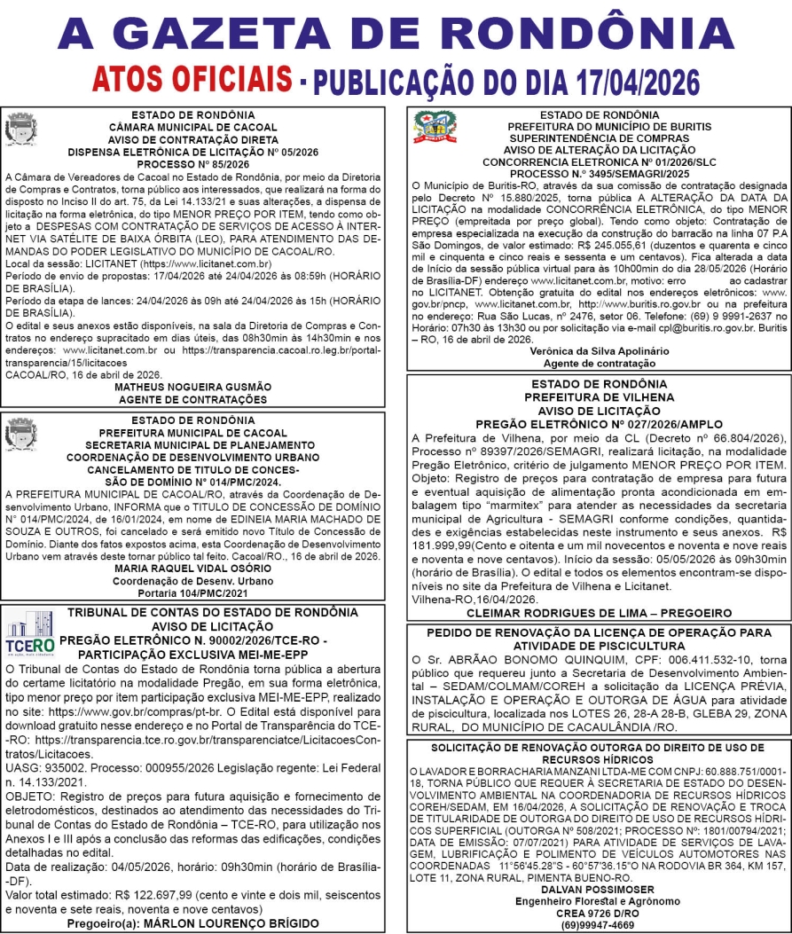 A GAZETA DE RONDÔNIA ATOS OFICIAIS PUBLICAÇÃO DO DIA 17/04/2026
