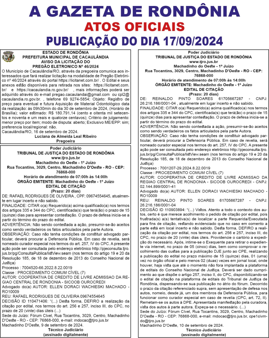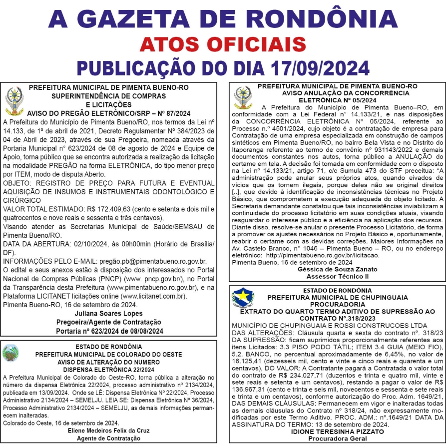 A GAZETA DE RONDÔNIA ATOS OFICIAIS PUBLICAÇÃO DO DIA 17/09/2024