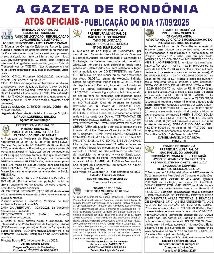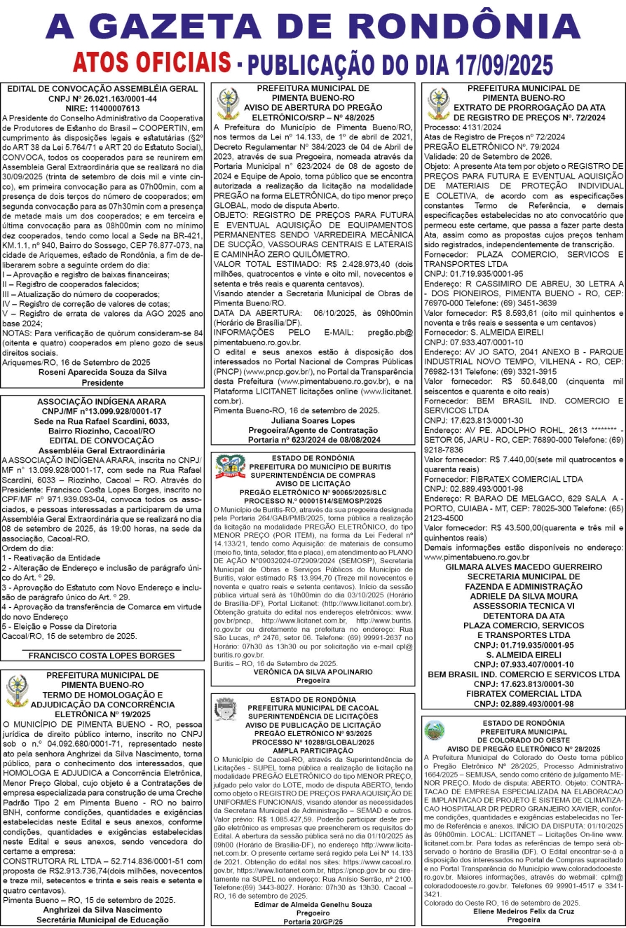 A GAZETA DE RONDÔNIA ATOS OFICIAIS PUBLICAÇÃO DO DIA 17/09/2025