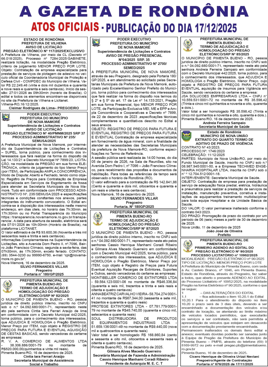 A GAZETA DE RONDÔNIA ATOS OFICIAIS PUBLICAÇÃO DO DIA 17/12/2025