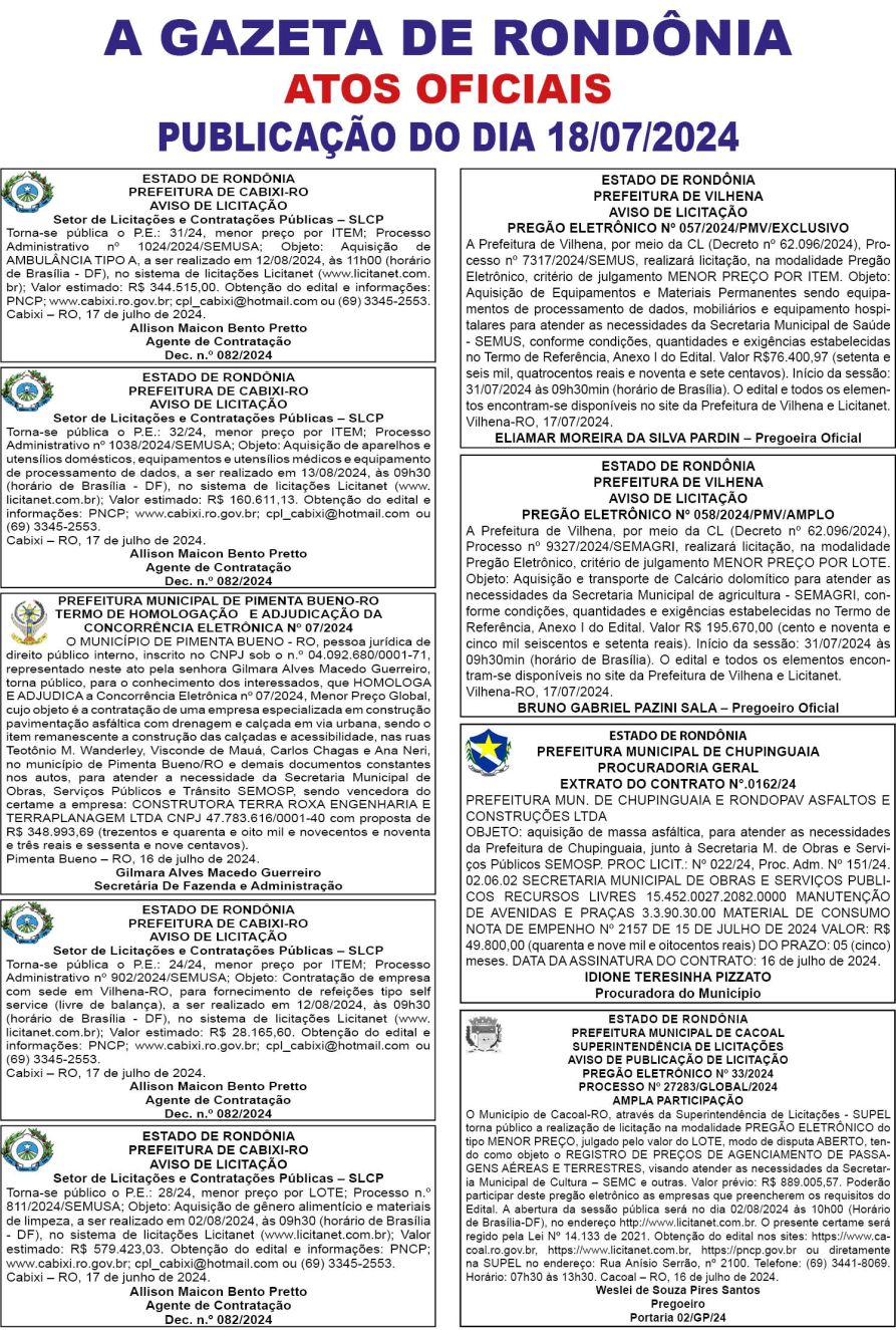 A GAZETA DE RONDÔNIA ATOS OFICIAIS PUBLICAÇÃO DO DIA 18/07/2024