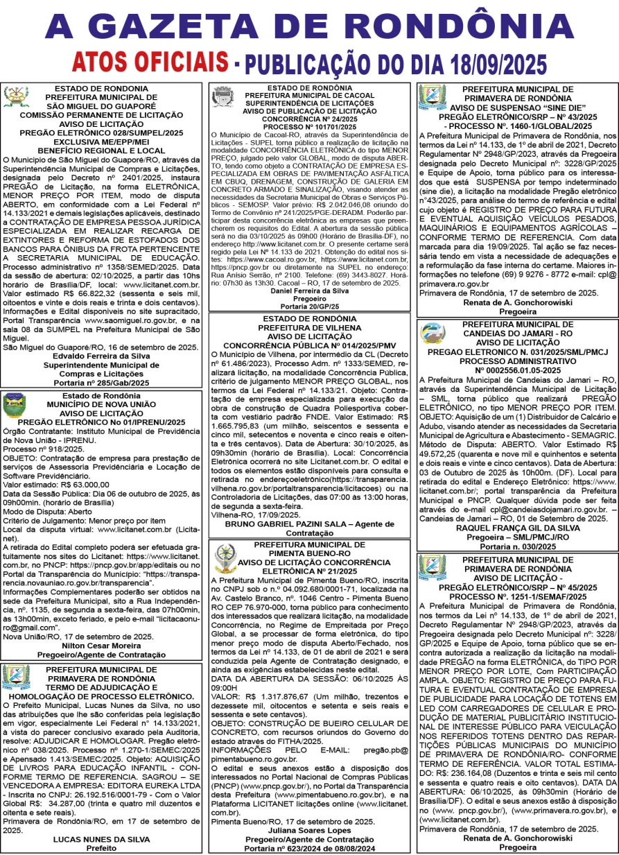 A GAZETA DE RONDÔNIA ATOS OFICIAIS PUBLICAÇÃO DO DIA 18/09/2025