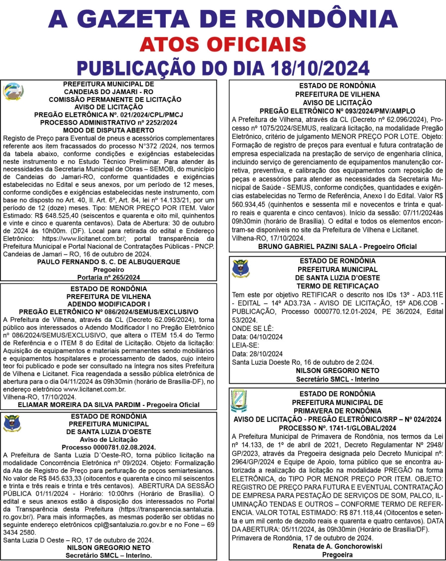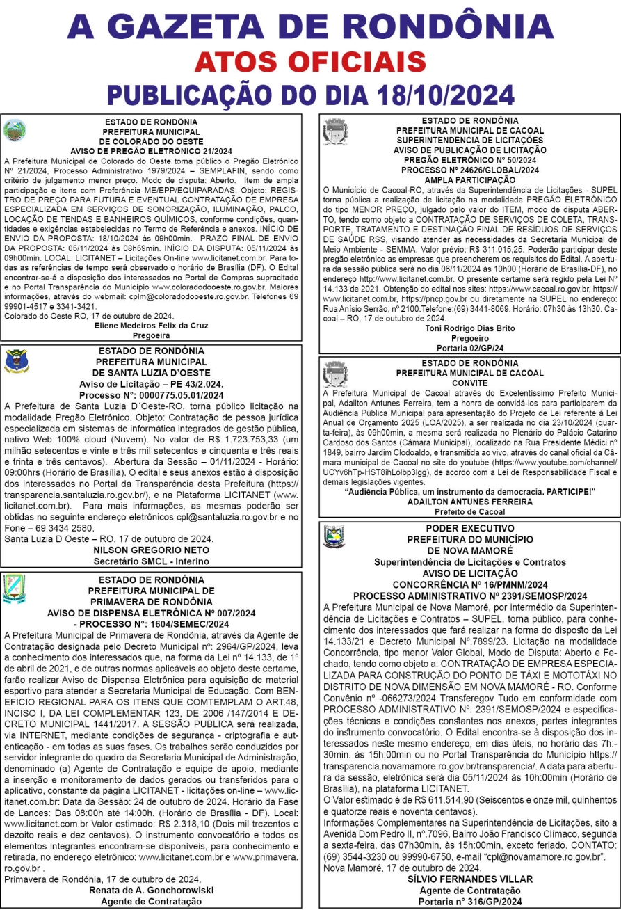 A GAZETA DE RONDÔNIA ATOS OFICIAIS PUBLICAÇÃO DO DIA 18/10/2024