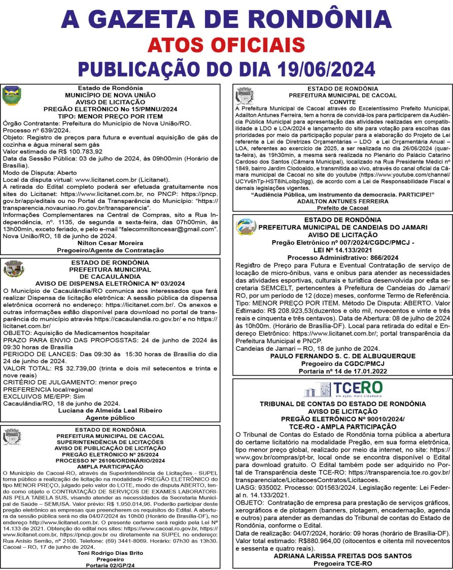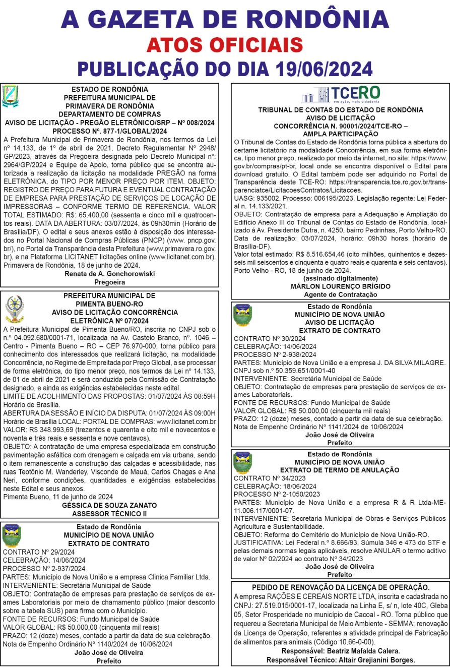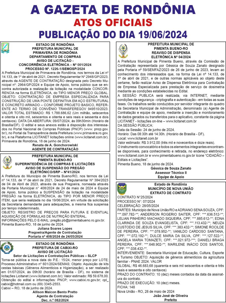 A GAZETA DE RONDÔNIA ATOS OFICIAIS PUBLICAÇÃO DO DIA 19/06/2024
