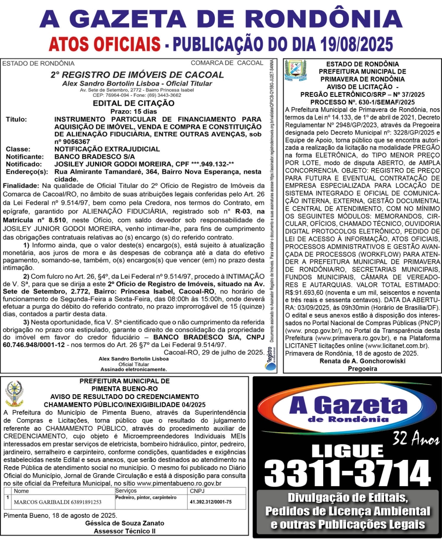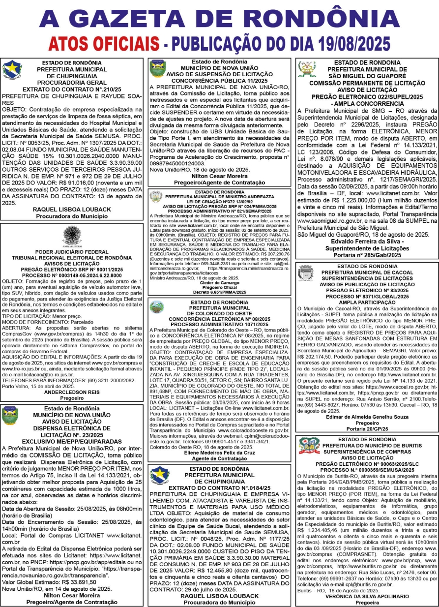 A GAZETA DE RONDÔNIA ATOS OFICIAIS PUBLICAÇÃO DO DIA 19/08/2025
