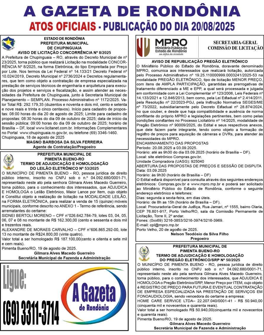 A GAZETA DE RONDÔNIA ATOS OFICIAIS PUBLICAÇÃO DO DIA 20/08/2025