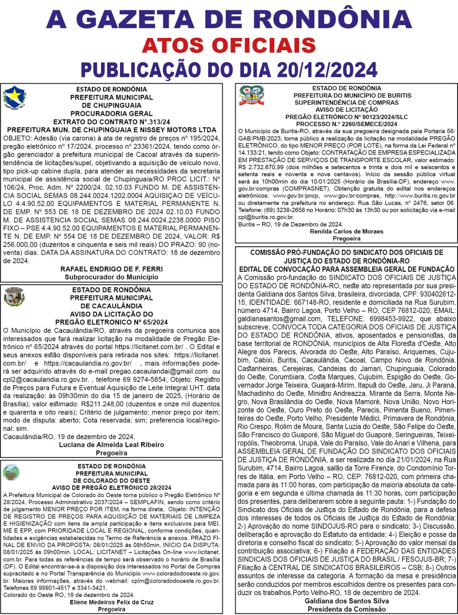 A GAZETA DE RONDÔNIA ATOS OFICIAIS PUBLICAÇÃO DO DIA 20/12/2024
