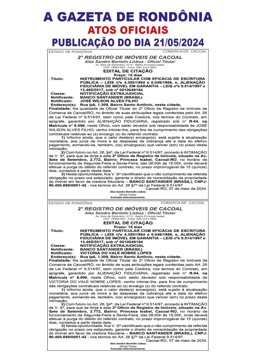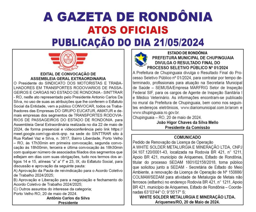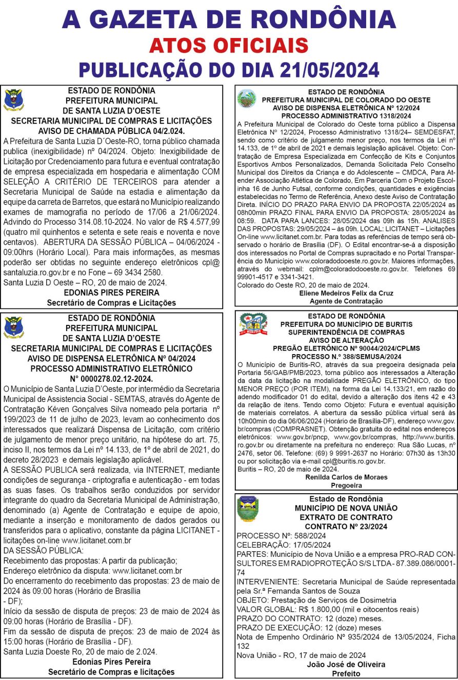 A GAZETA DE RONDÔNIA ATOS OFICIAIS PUBLICAÇÃO DO DIA 21/05/2024