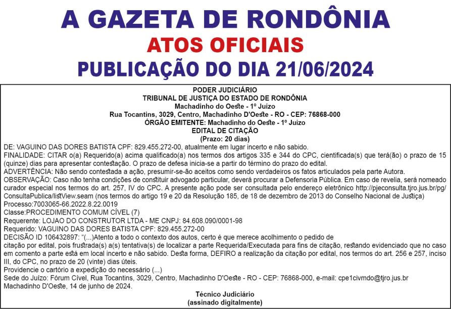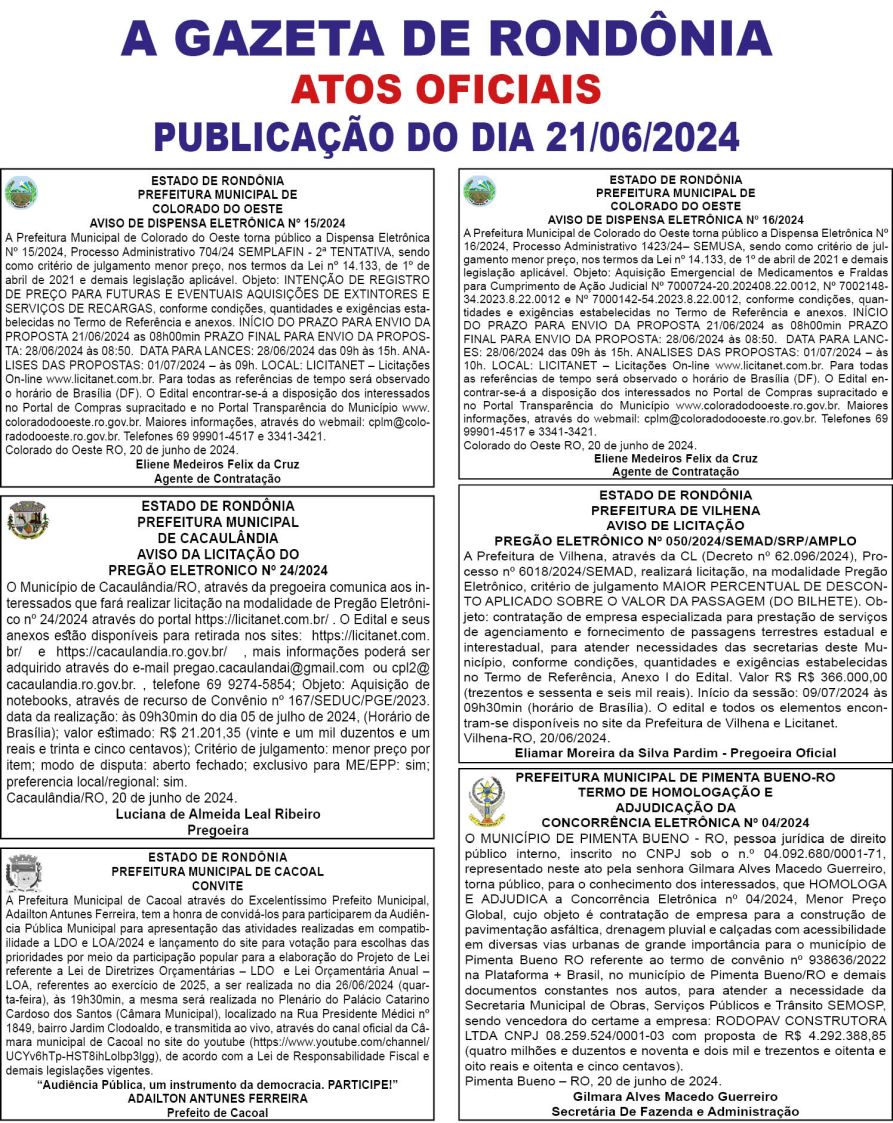 A GAZETA DE RONDÔNIA ATOS OFICIAIS PUBLICAÇÃO DO DIA 21/06/2024
