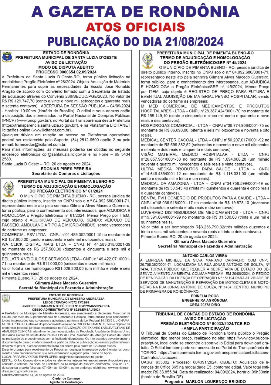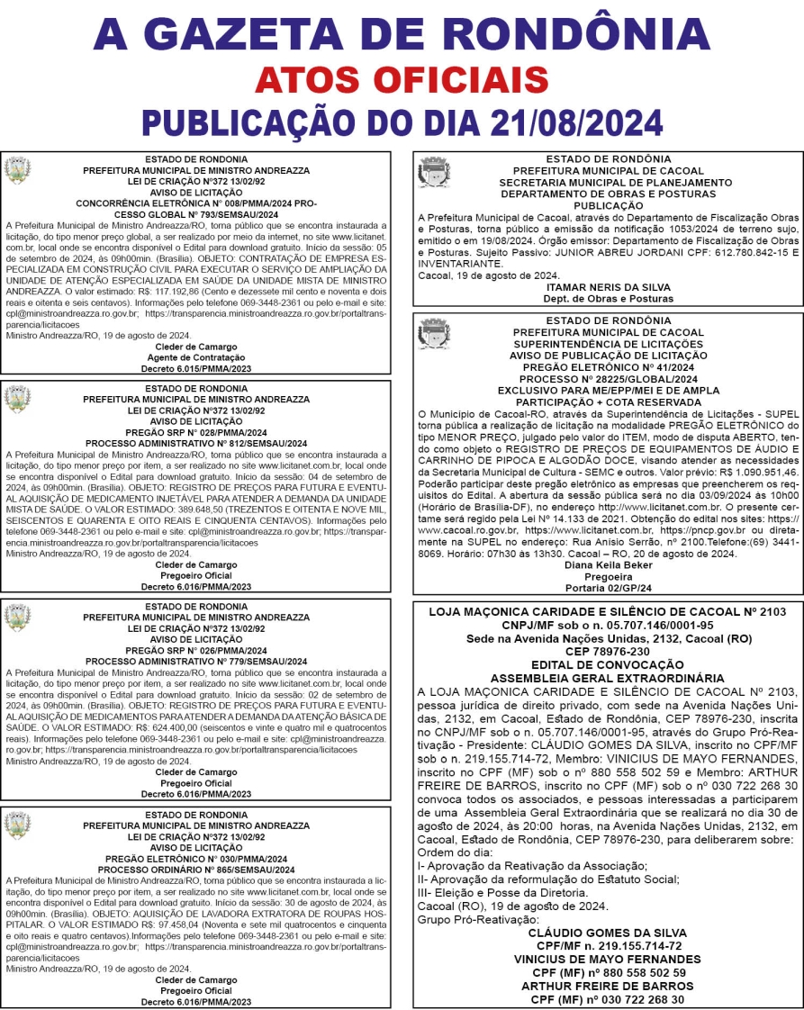 A GAZETA DE RONDÔNIA ATOS OFICIAIS PUBLICAÇÃO DO DIA 21/08/2024