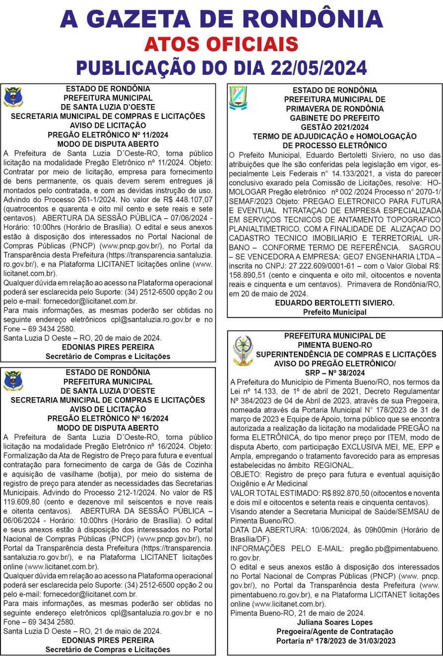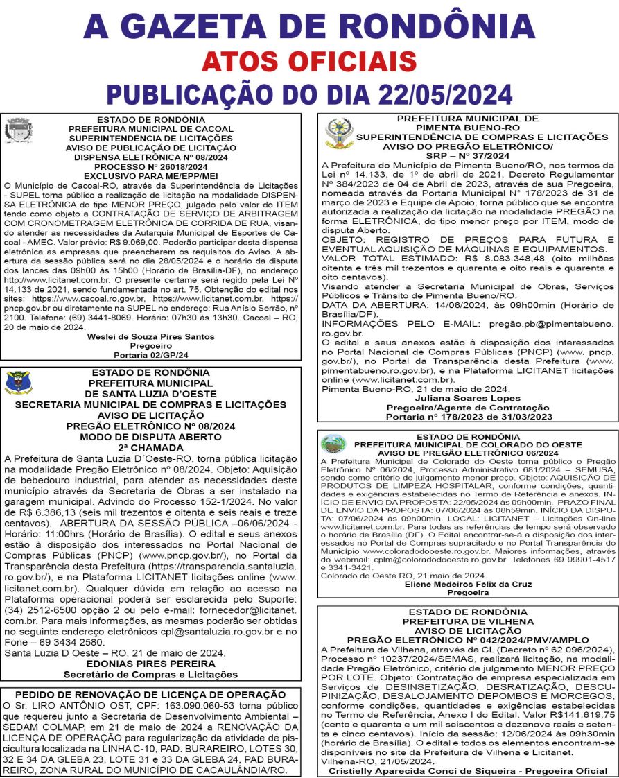 A GAZETA DE RONDÔNIA ATOS OFICIAIS PUBLICAÇÃO DO DIA 22/05/2024
