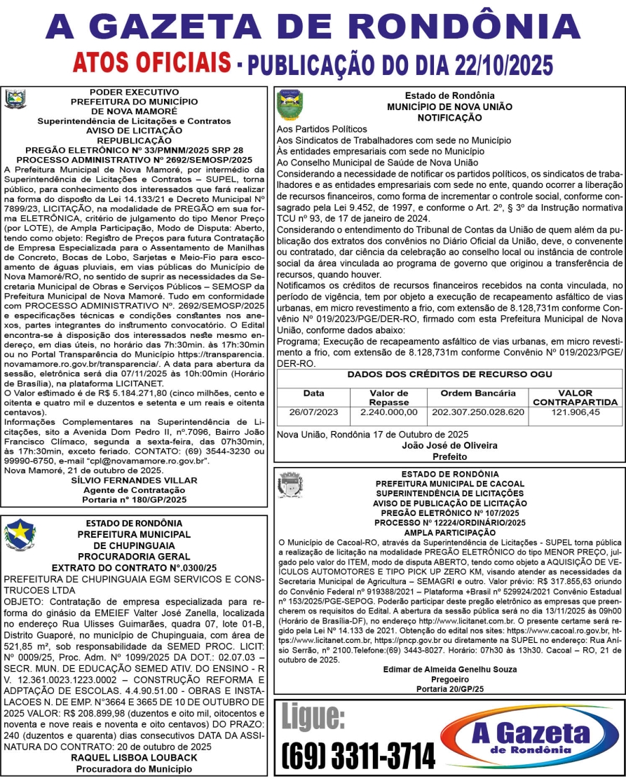A GAZETA DE RONDÔNIA ATOS OFICIAIS PUBLICAÇÃO DO DIA 22/10/2025
