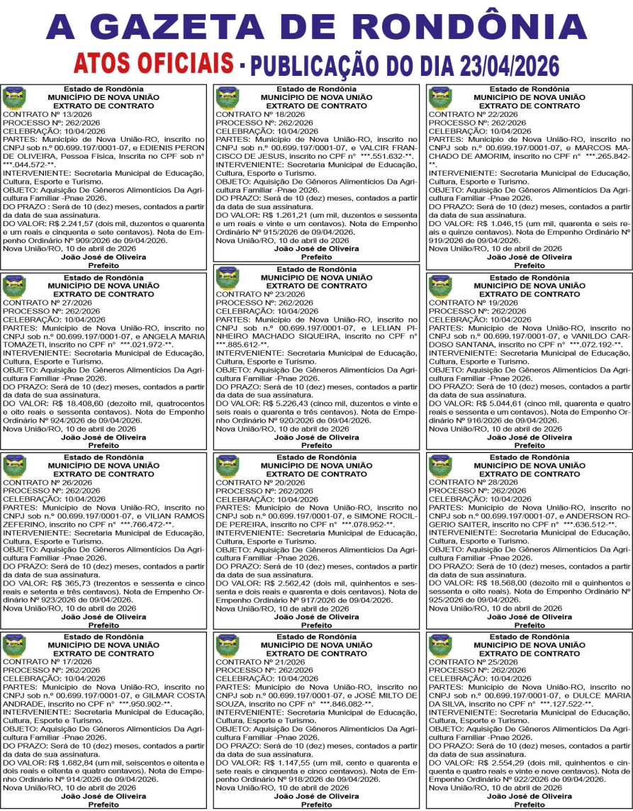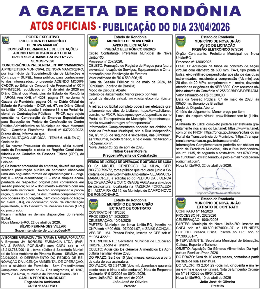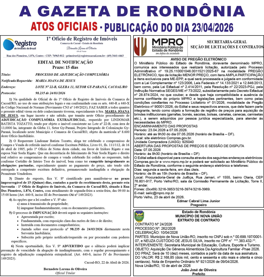 A GAZETA DE RONDÔNIA ATOS OFICIAIS PUBLICAÇÃO DO DIA 23/04/2026